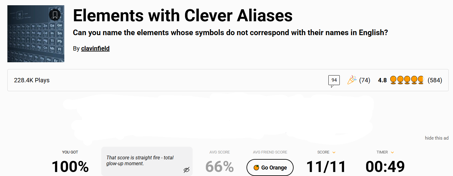 Recently, I've been on a quest to learn all the elements. I got 11/11 without cheating.