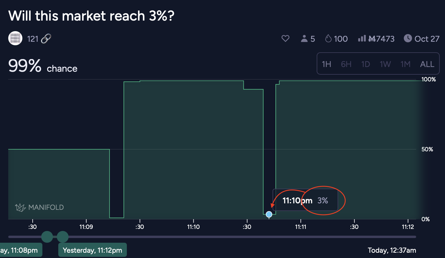 Anyway, why would you have needed to fill limit orders at 3%? As soon as one share sells for 3%, you can pump YES.