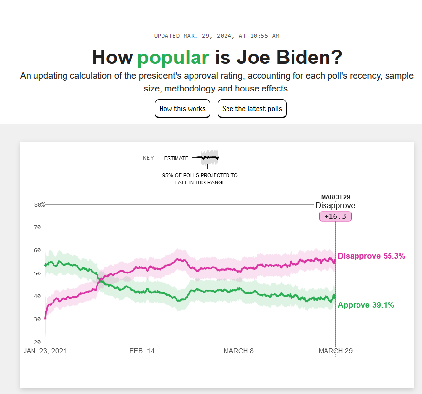 This resolves as per the FiveThirtyEight weighted average of approval polls for President Biden at 23:59 Eastern Time. I will look at the large number displayed here, rounded to the nearest tenth of a percent:
