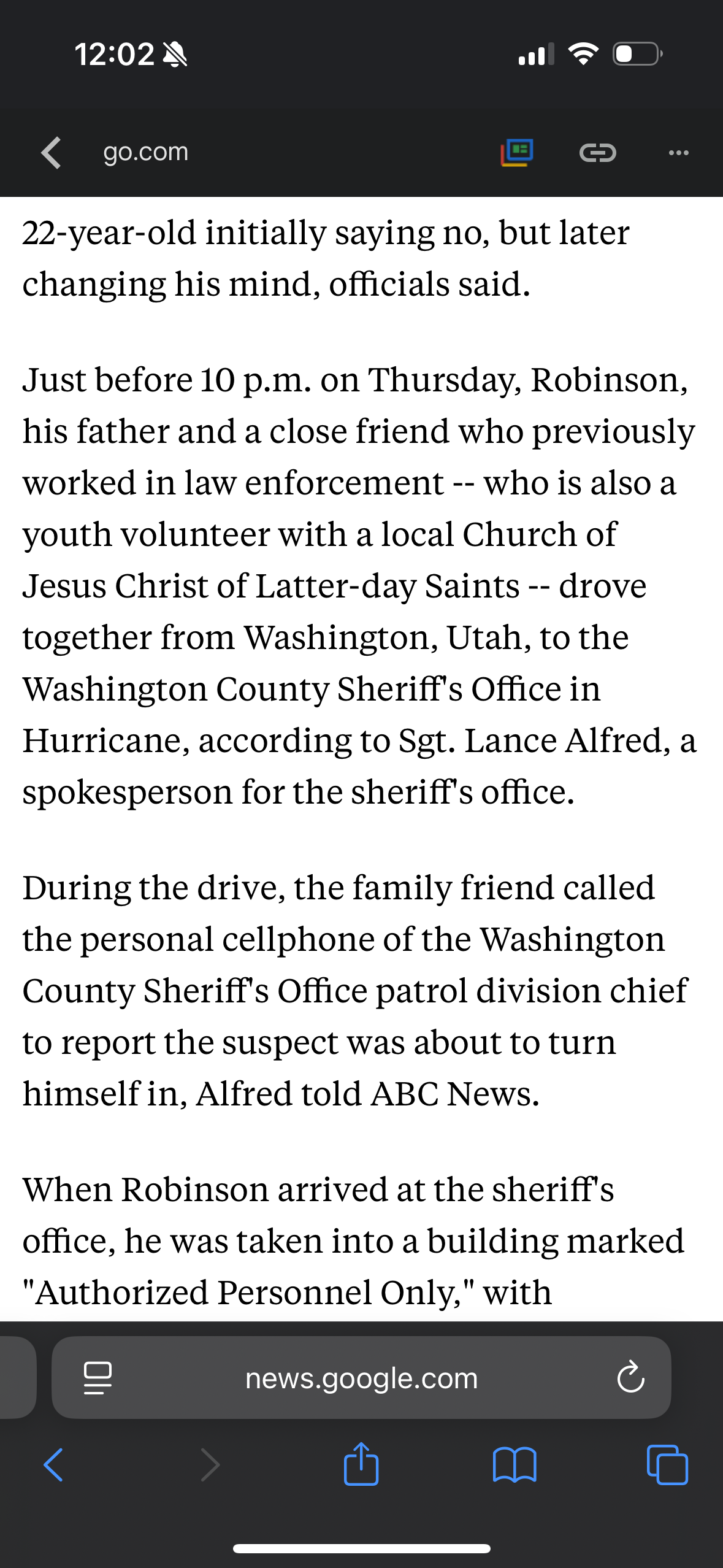 Just before 10 p.m. on Thursday, Robinson, his father and a close friend who previously worked in law enforcement — [...] — drove together from Washington, Utah, to the Washington County Sheriff's Office in Hurricane, according to Sgt. Lance Alfred, a spokesperson for the sheriff's office.
