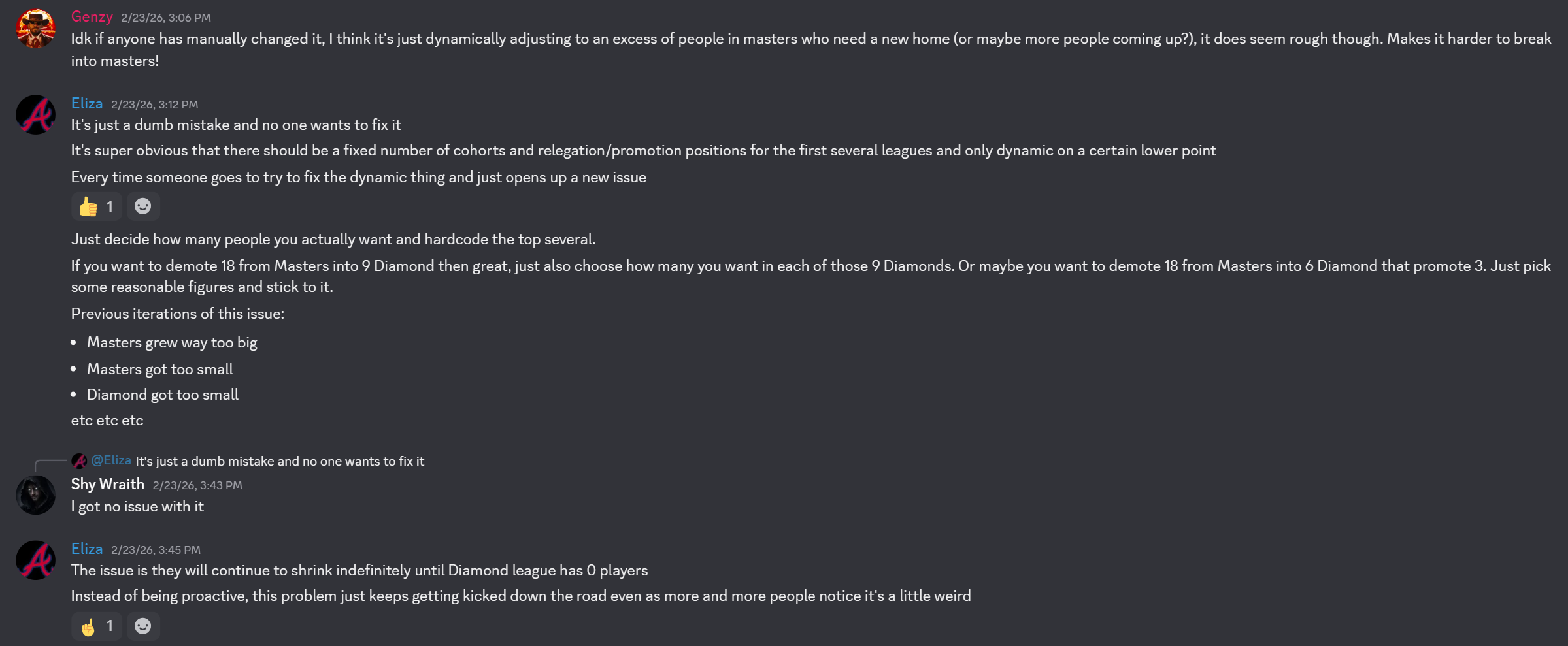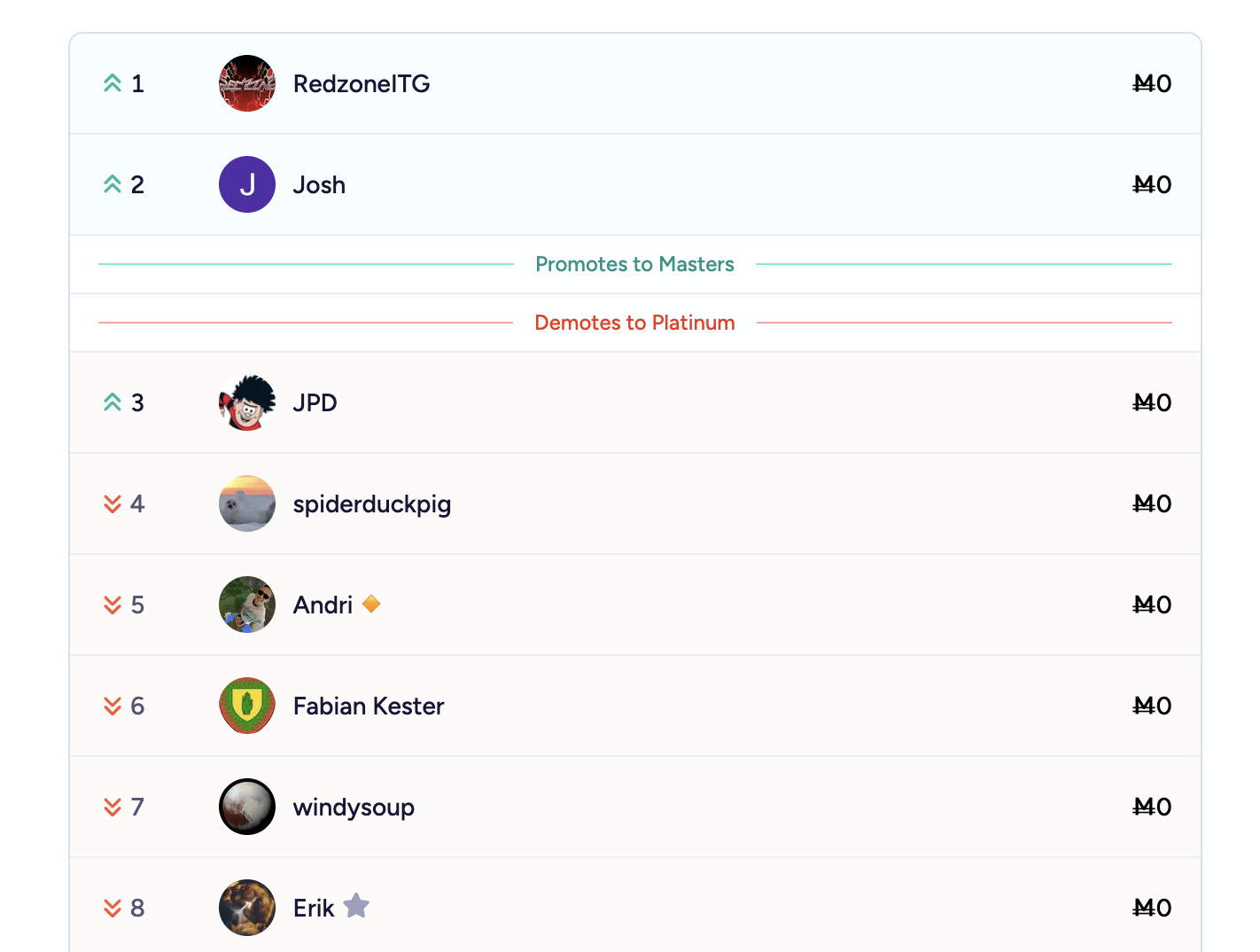 @4fa Have a closer look at Lucky Minotaurs: 2 stay in that league. I had missed that myself as well and had to edit my comment. And if I didn't mess up counting, it should indeed be 2 per each Diamond promoting to Masters for a total of 18. Fits with 18 demoting from Masters.