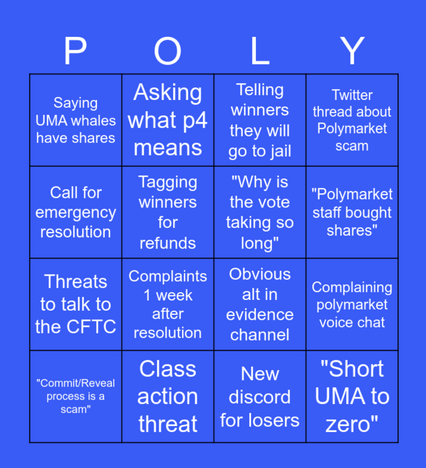 When will the attached bingo card get bingo? Only messages sent after the creation of the market will count. This will be based on messages sent in the UMA discord server. I will do my best to keep up with messages and mark down spaces to be crossed out however, if you think I've missed something, take a screenshot and link to the statement in the comments.