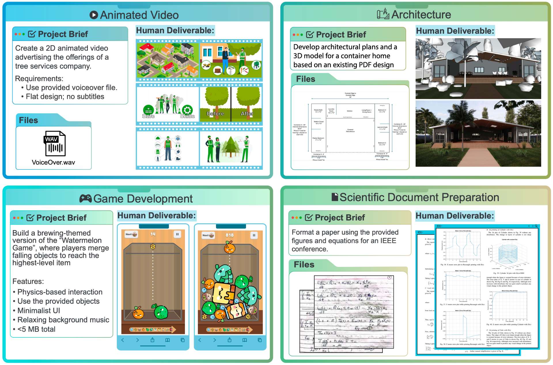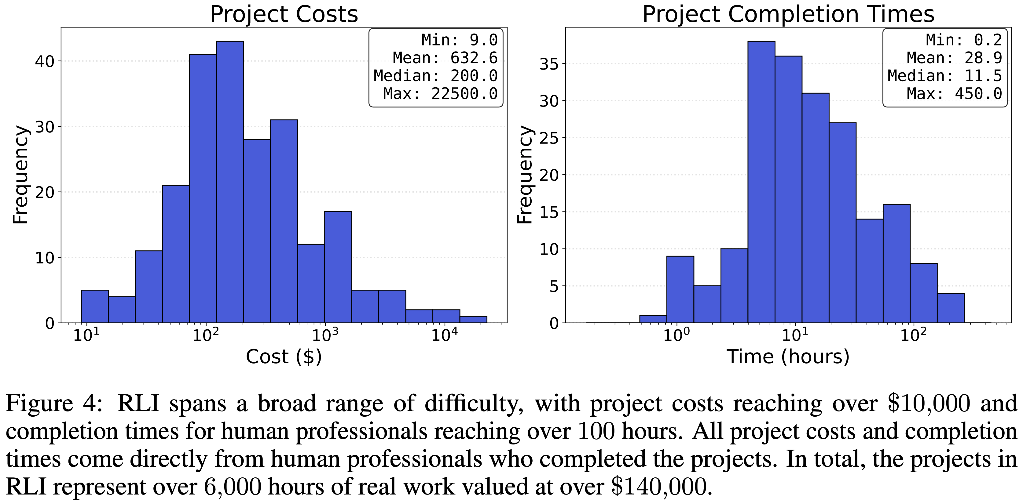 The Remote Labor Index (RLI) is a benchmark of 240 long-horizon remote labor tasks, collected as a representative sample of fully-remote labor performed by freelancers. Tasks in the dataset take human professionals between several hours to several hundred hours (see figures from the paper below).