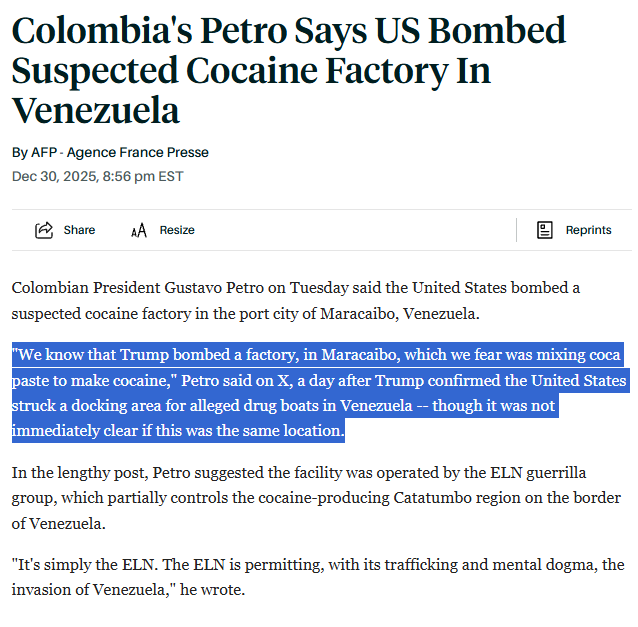 @Xizted Actually it is possible the strike Colombian president is referring to is not the same strike Trump was talking about, at least according to this article. https://www.barrons.com/news/colombia-s-petro-says-us-bombed-suspected-cocaine-factory-in-venezuela-8e7f4bf0