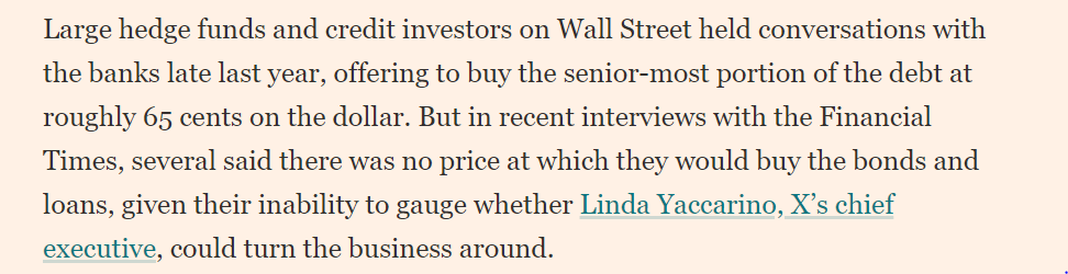 “Large hedge funds and credit investors on Wall Street held conversations with the banks late last year, offering to buy the senior-most portion of the debt at roughly 65 cents on the dollar. But in recent interviews with the Financial Times, several said there was no price at which they would buy the bonds and loans, given their inability to gauge whether Linda Yaccarino, X's chief executive, could turn the business around.”