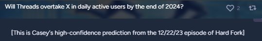 But metaculus doesn't have much to go on for this either, and resolves YES if "Meta publicly reports Threads has a Monthly Active User number higher than the best public estimates of Twitter's MAUs at that time" - that also could be a post from Zuck vs a tweet from Musk.