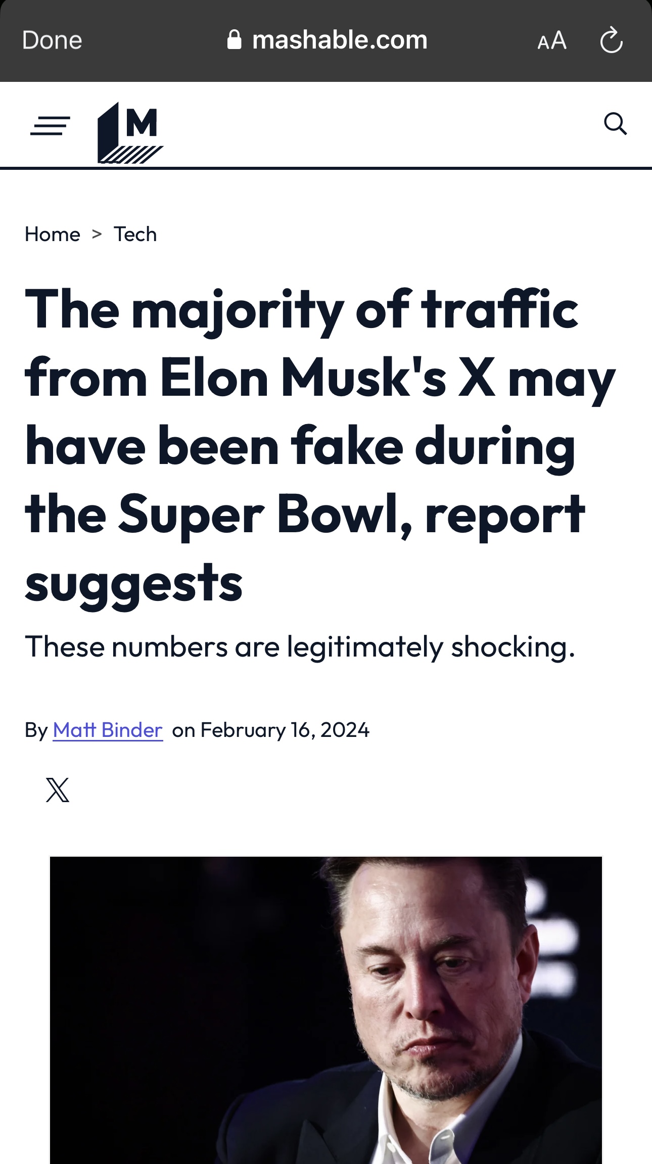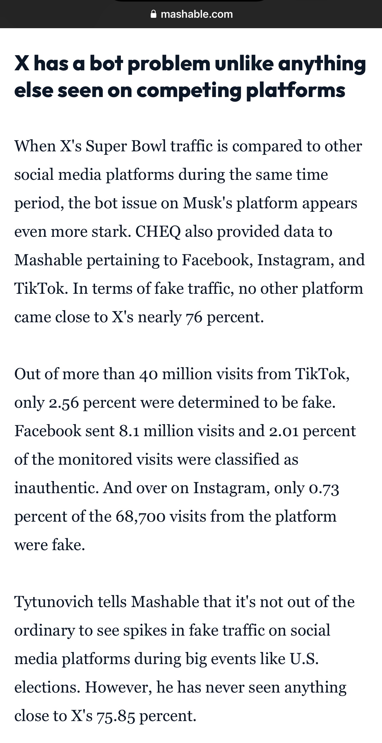 “When X's Super Bowl traffic is compared to other social media platforms during the same time period, the bot issue on Musk's platform appears even more stark. CHEQ also provided data to Mashable pertaining to Facebook, Instagram, and TikTok. In terms of fake traffic, no other platform came close to X's nearly 76 percent.