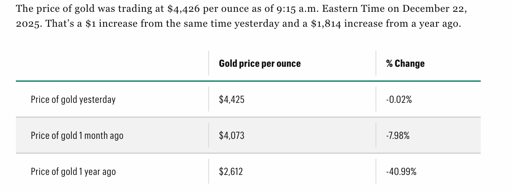 Gold rose to 4,400.91 USD per troy ounce on December 22, 2025, up 1.34% from the previous day. Gold broke through $4,400 per ounce for the first time on Monday, hitting an all-time high on expectations of US interest rate cuts and escalating geopolitical tensions. Bullion has surged more than 60% so far this year, on track for its best year since 1979.