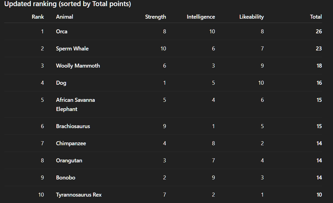 An animal’s overall score is the sum of the points it receives across all three trait rankings.
