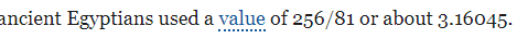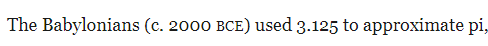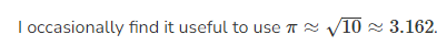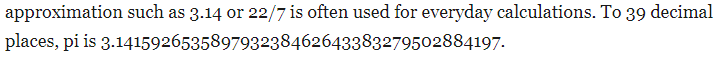 After Pi Day ends, I will search on Google for "approximate value of pi" and look for articles that give me a decimal (not fractional) approximate value of pi. Every approximation with more than 2 decimal places will be recorded (i.e., 3.14 is excluded).