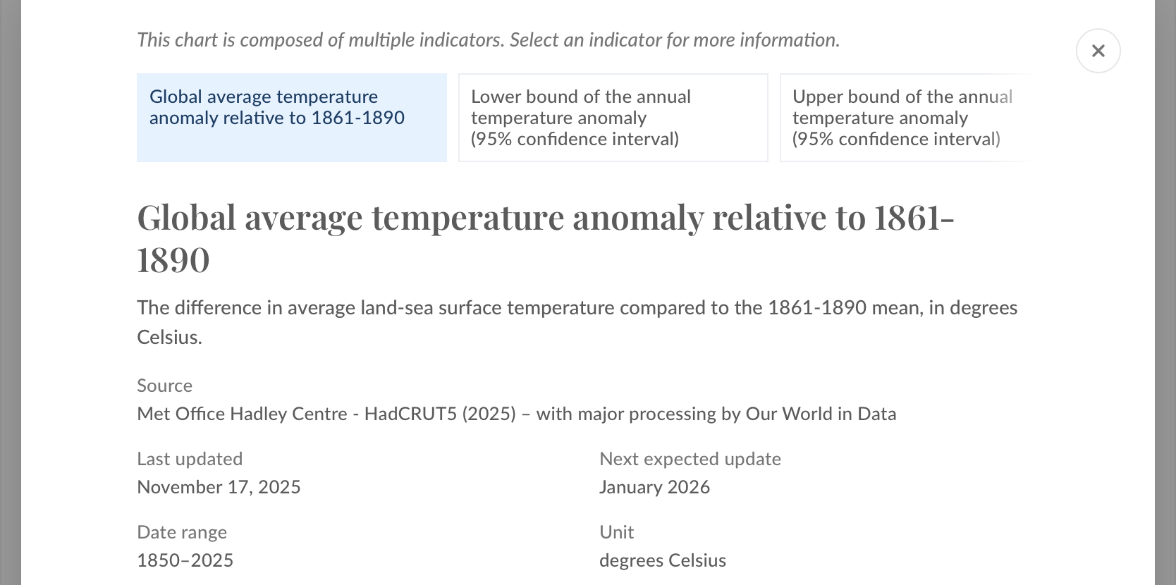 Met Office Hadley Centre - HadCRUT5 (2025) – with major processing by Our World in Data. “Global average temperature anomaly relative to 1861-1890” [dataset]. Met Office Hadley Centre, “HadCRUT5 HadCRUT.5.0.2.0” [original data]."So it does look like it is using that old dataset that ends Feb 2025. If they don't change that by the end of the month and the question says to use Our world in data which was clear about using HadCRUT5 HadCRUT.5.0.2.0 then should it resolve like that?