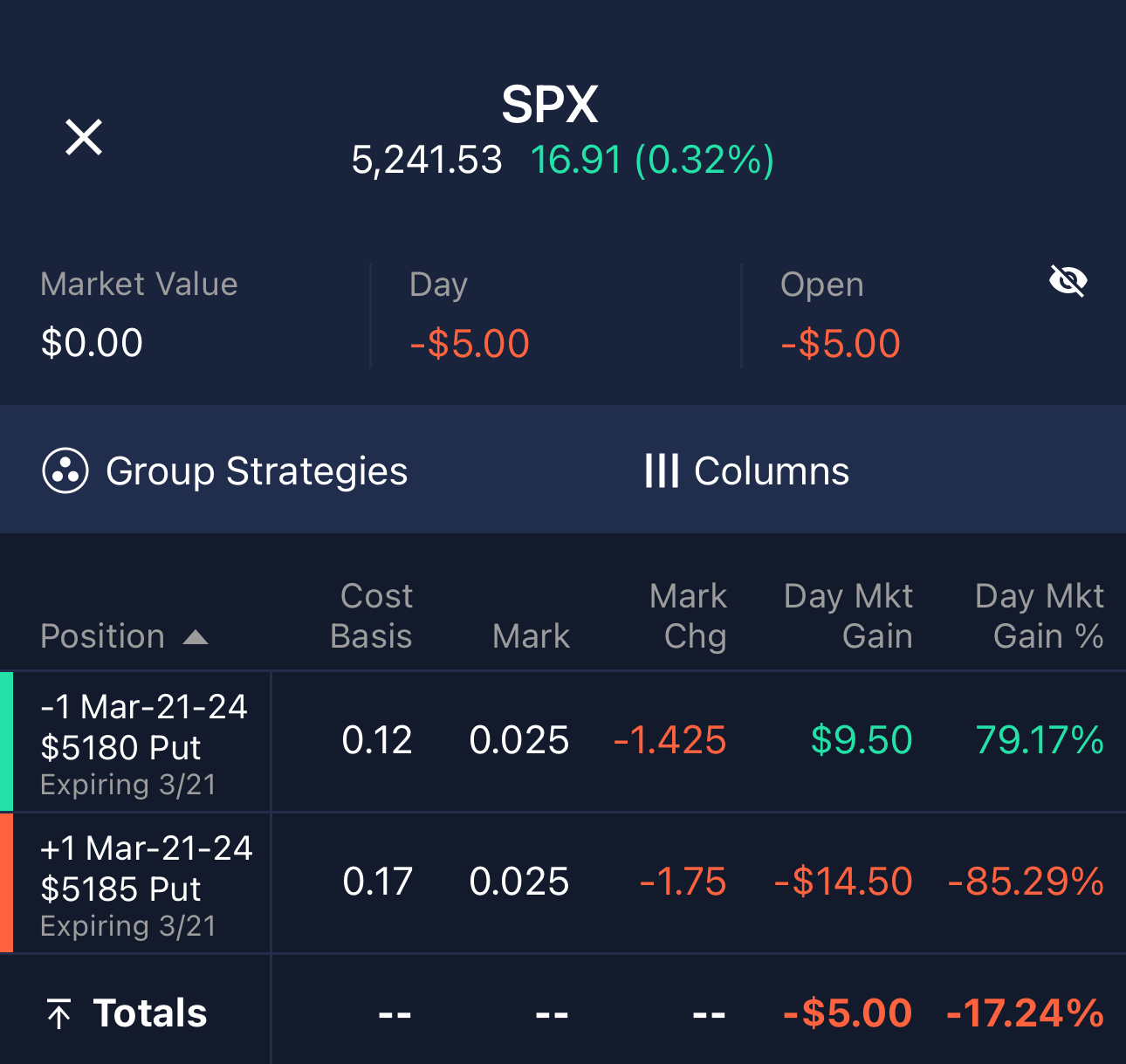 Ok, some context on today because it’s too funny to not explain. Last night I saw /ES ripping, so it set the stage for a play on this market. Made some bets on Yes, but hard to say how well overnight will translate to the day. Checked Yahoo finance for yesterday’s close as a starting point first thing this morning, $5,178.51. Ok great, SPX bear out spread on 5185/5180 is priced at $0.05, implying 99% for this market. And cmon, it’s $5, might as well buy the hedge and go all in since I’d make $500 if we do close < $5,180.