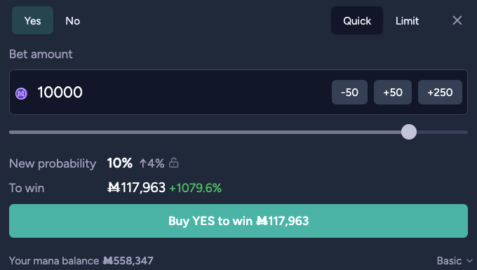 @Eliza place the bet, it will only climb to 10% and if the odds ever climb past that you can make profit already without fully comitting to a YES