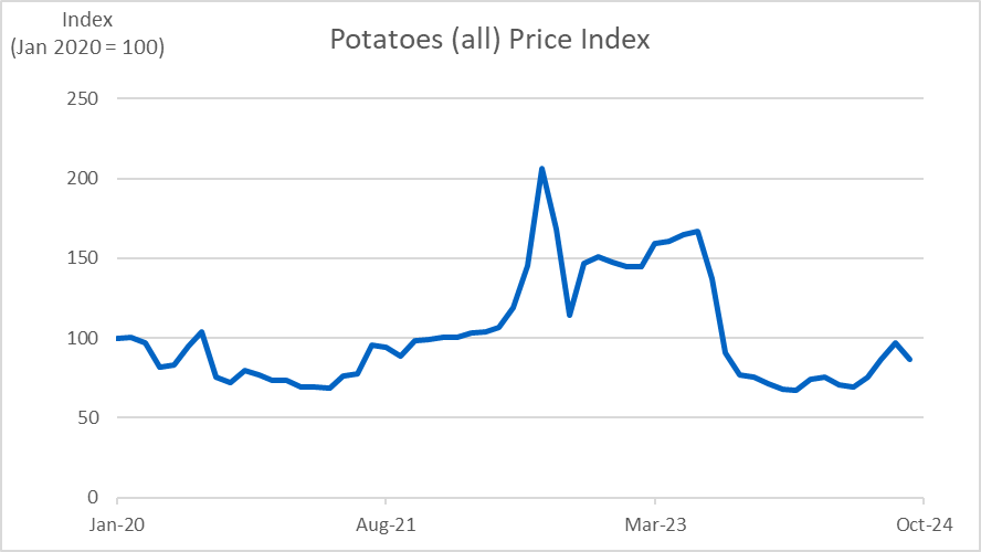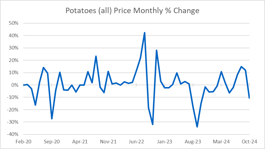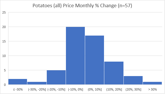 Some historical data from USDA. About 20% (12/57) of months in the last 5 years of data had monthly growth in potato prices >10%
