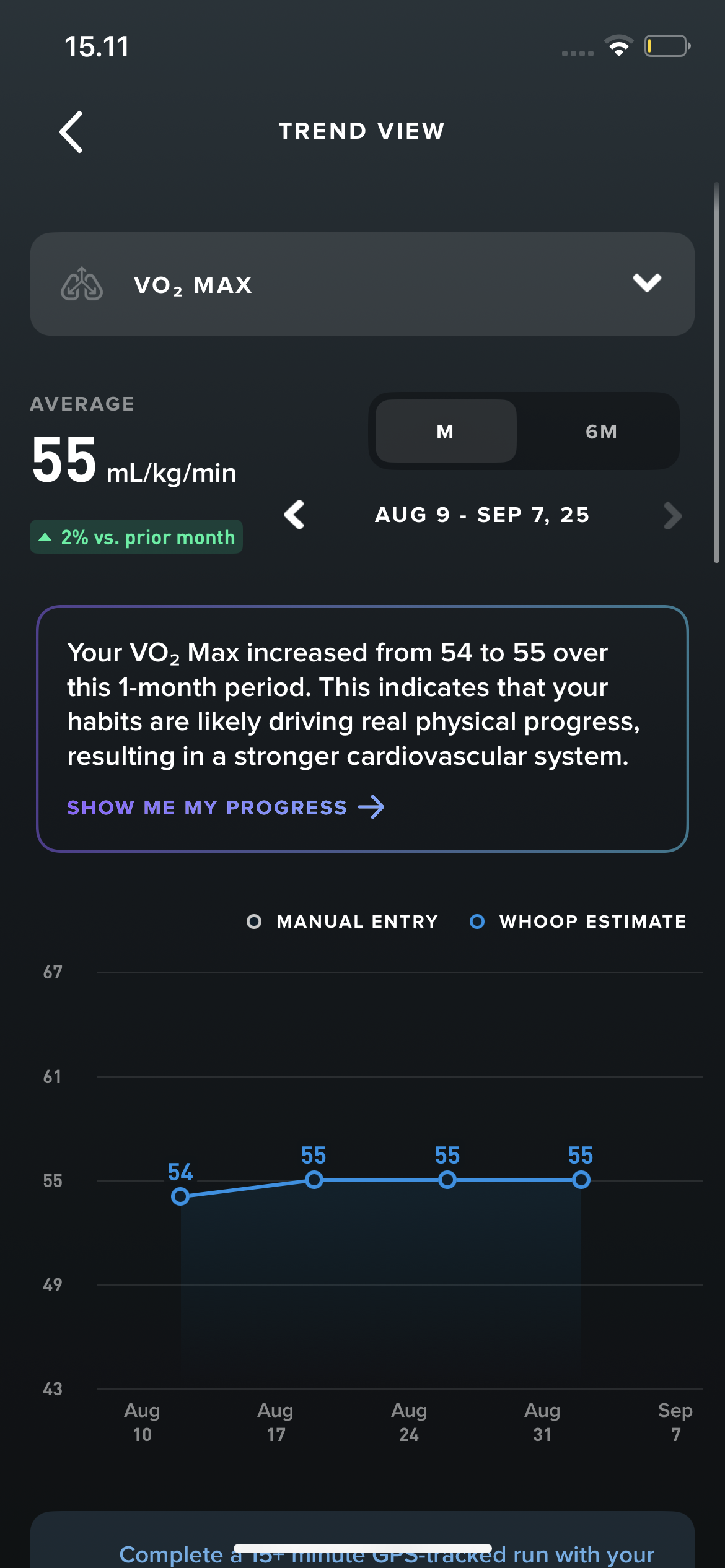 My Whoop has estimated a rise in VO2 max from 52 to 54 over the past four weeks.