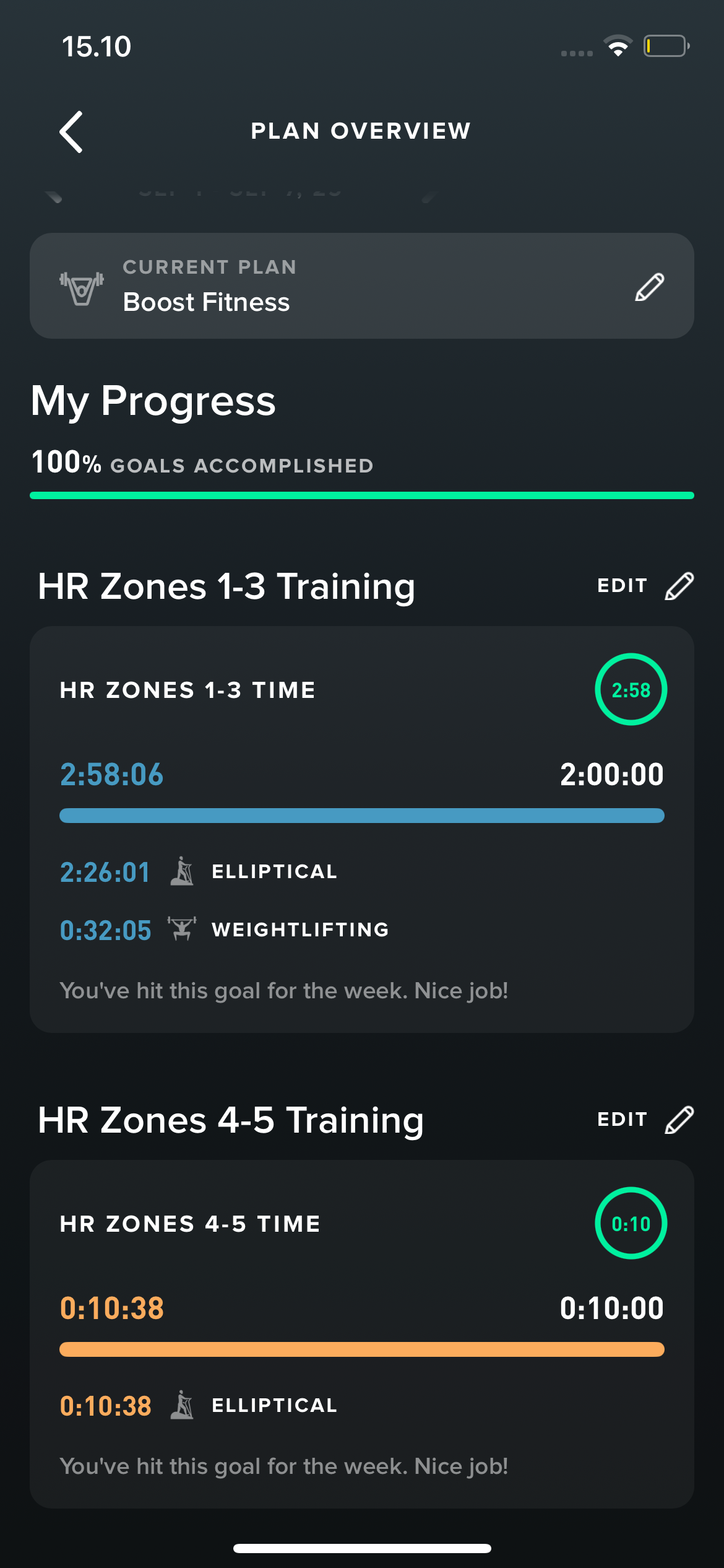 I am doing 2 hours of zone 2 training, and one 4x4 interval training session per week, all done on an elliptical machine