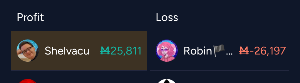 @Shelvacu An interesting factoid is that the top winner rarely takes mana from the top loser, they bet at opposite ends of the percentages mostly. Not in all cases, but as a rule.