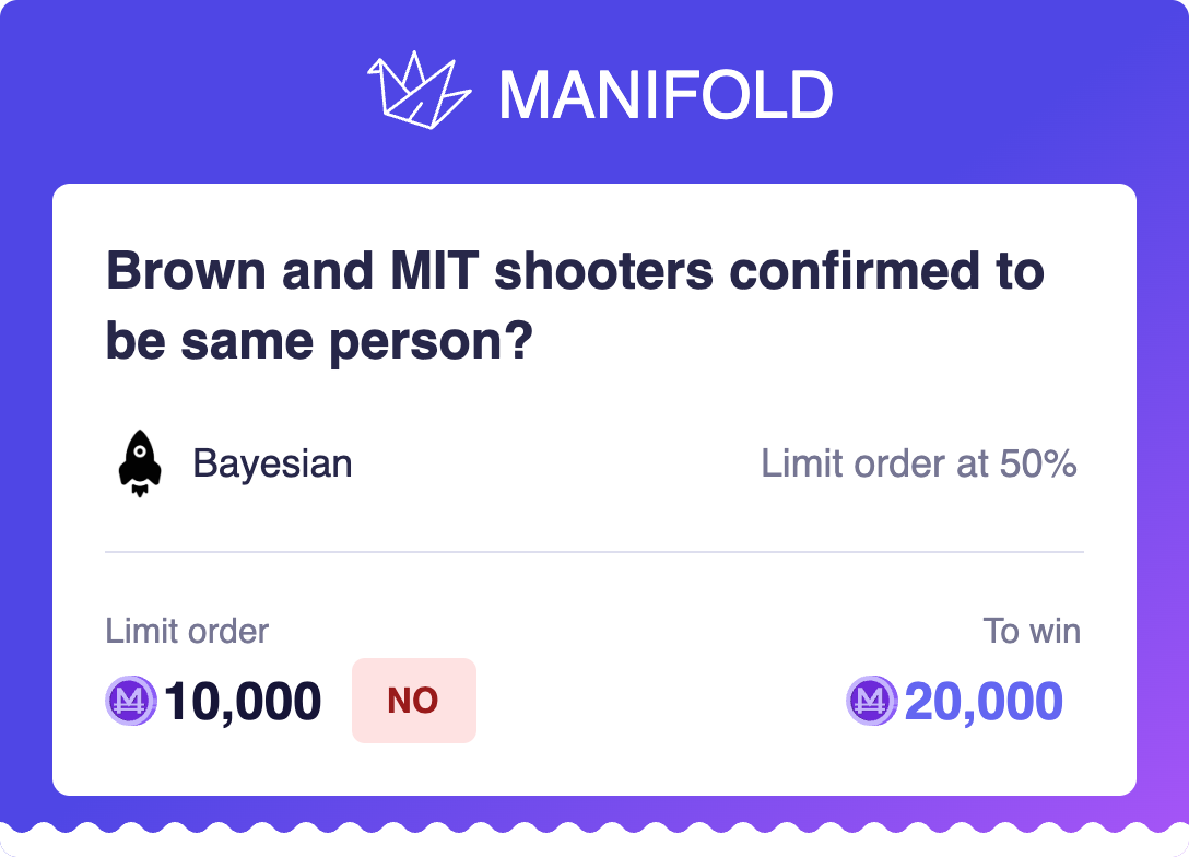 This market will resolve as soon as official statements from relevant U.S. law enforcement agencies, or a consensus of credible reporting, have clearly confirmed whether or not the same individual or individuals committed the Brown shooting and the MIT professor shooting. Speculation or unconfirmed reports will not count.