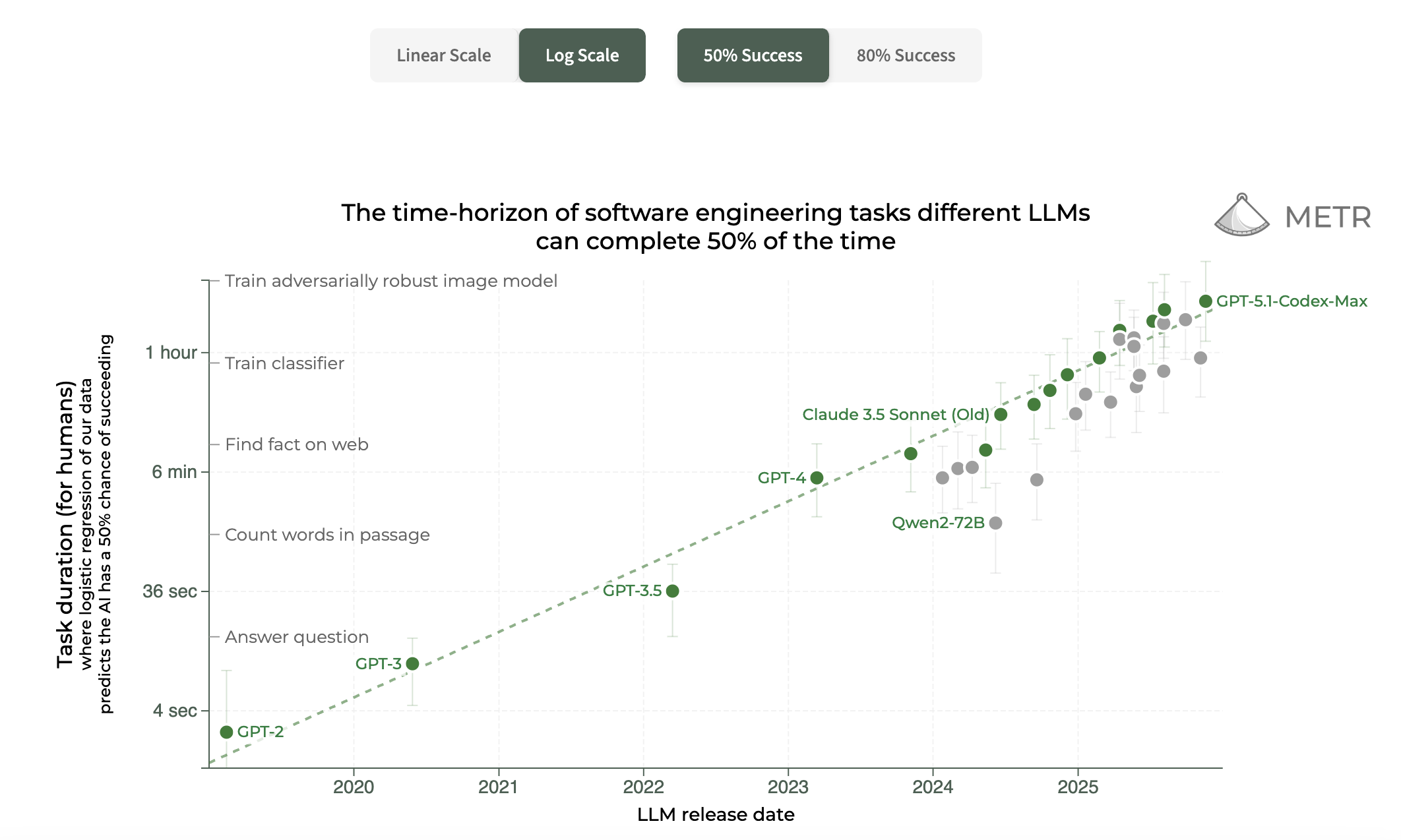 50% time horizon is a measure of AI autonomy based on the length of tasks that AI can do: roughly, it is the time that humans take to complete tasks that an AI system can successfully do 50% of the time. See METR's "Measuring AI Ability to Complete Long Tasks" for the technical definition. Claude 3.7 Sonnet, released in February 2025, was the leading model with a 50% horizon of 59 minutes.