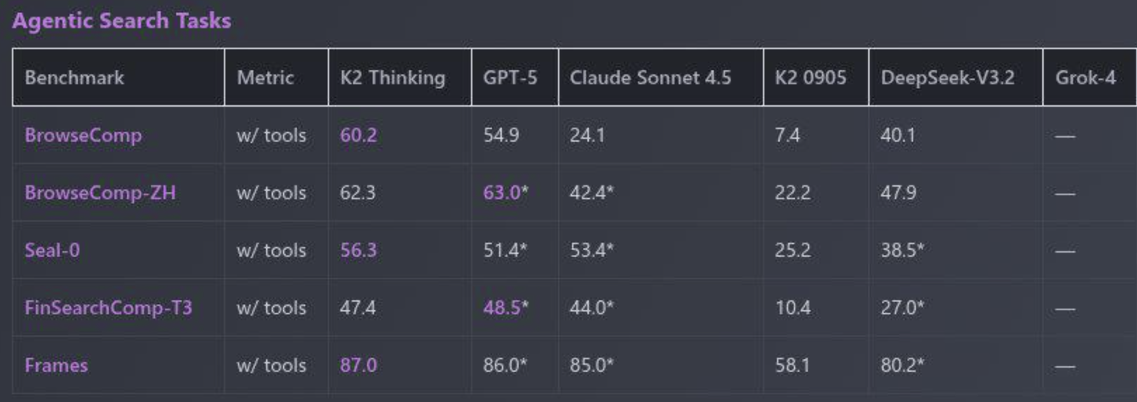 @MikhailDoroshenko do you think k2-thinking is particularly better at internet-based research than the other frontiermodels and that gives it the upper hand on HLE when internet search is allowed?