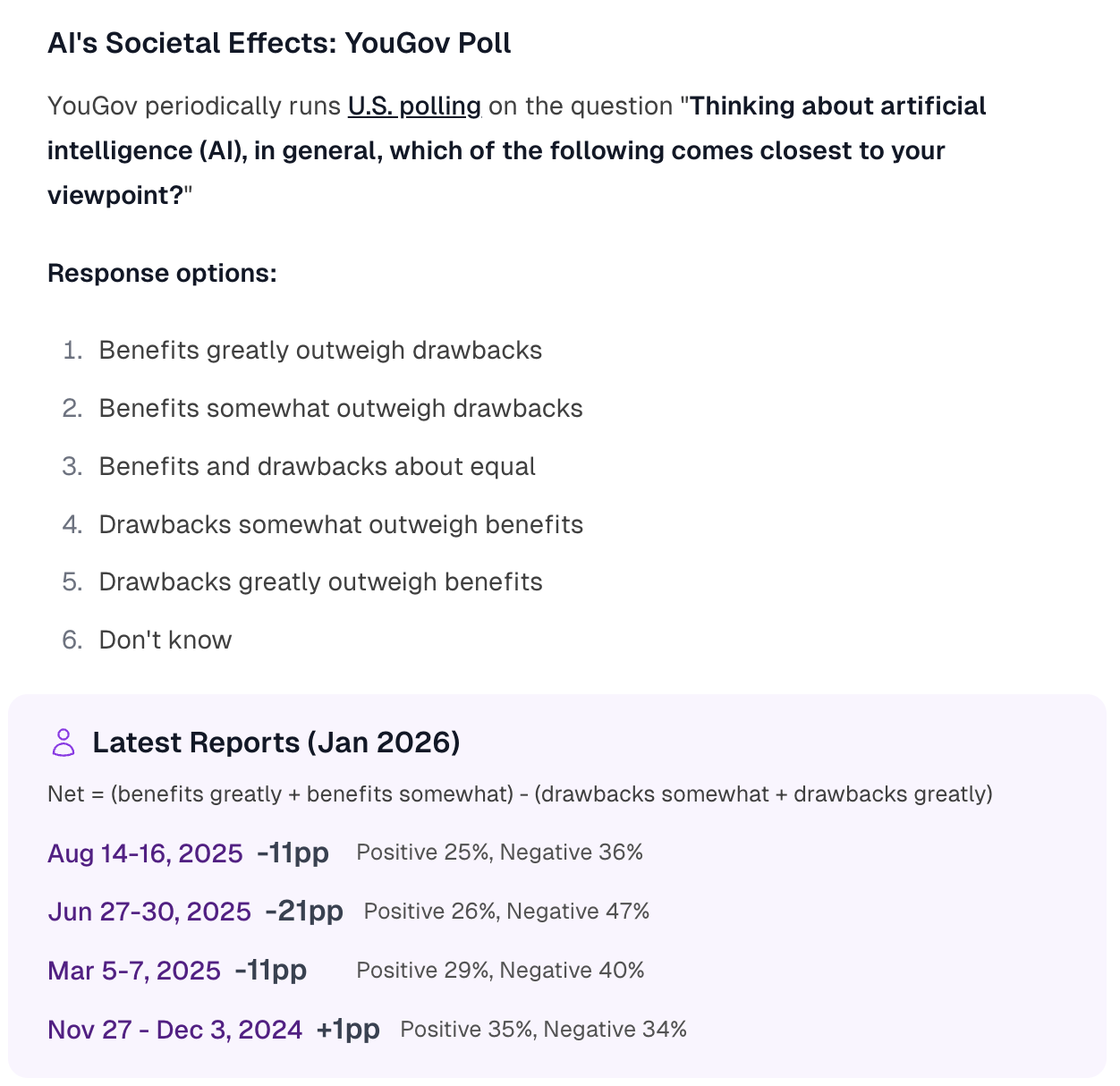 Acceptable question wordings: Either the "benefits vs drawbacks" phrasing or the "positive vs negative effect on society" phrasing (see the "More Info" section above) are acceptable for resolution. If YouGov uses a different wording that the resolver judges comparable, that may also be used. If no comparable poll is conducted in the last 6 months of 2026, the question will be resolved as ambiguous.