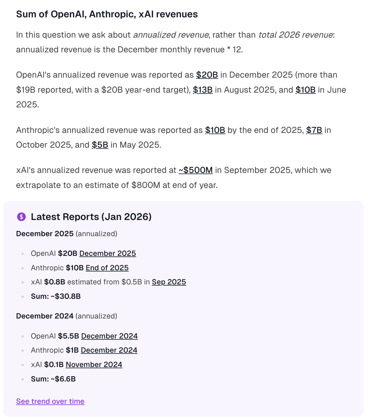 This market matches Sum of OpenAI, Anthropic, xAI revenues from the AI 2026 Forecasting Survey by AI Digest.