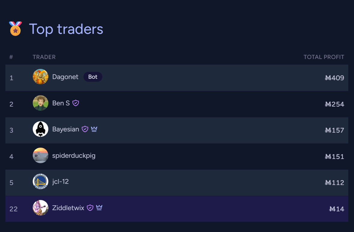 a very even match, taking a grueling ~40 rounds to crown a winner (lasting long enough that a few markets started to repeat). I definitely had some lucky guesses in the original week to make the finals (my avg will probably be higher going forward). Thanks to @Bayesian (and Claude) for coding up a very cool site to run the finals