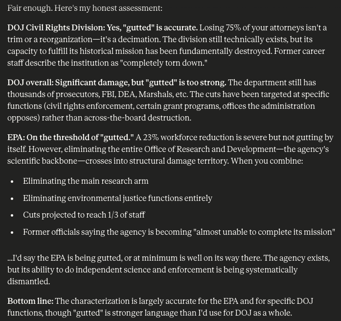 @traders there's genuine ambiguity about whether the DOJ and EPA were gutted. As I'm not really following US politics, I don't have an opinion one way or the other. Here's Claude: