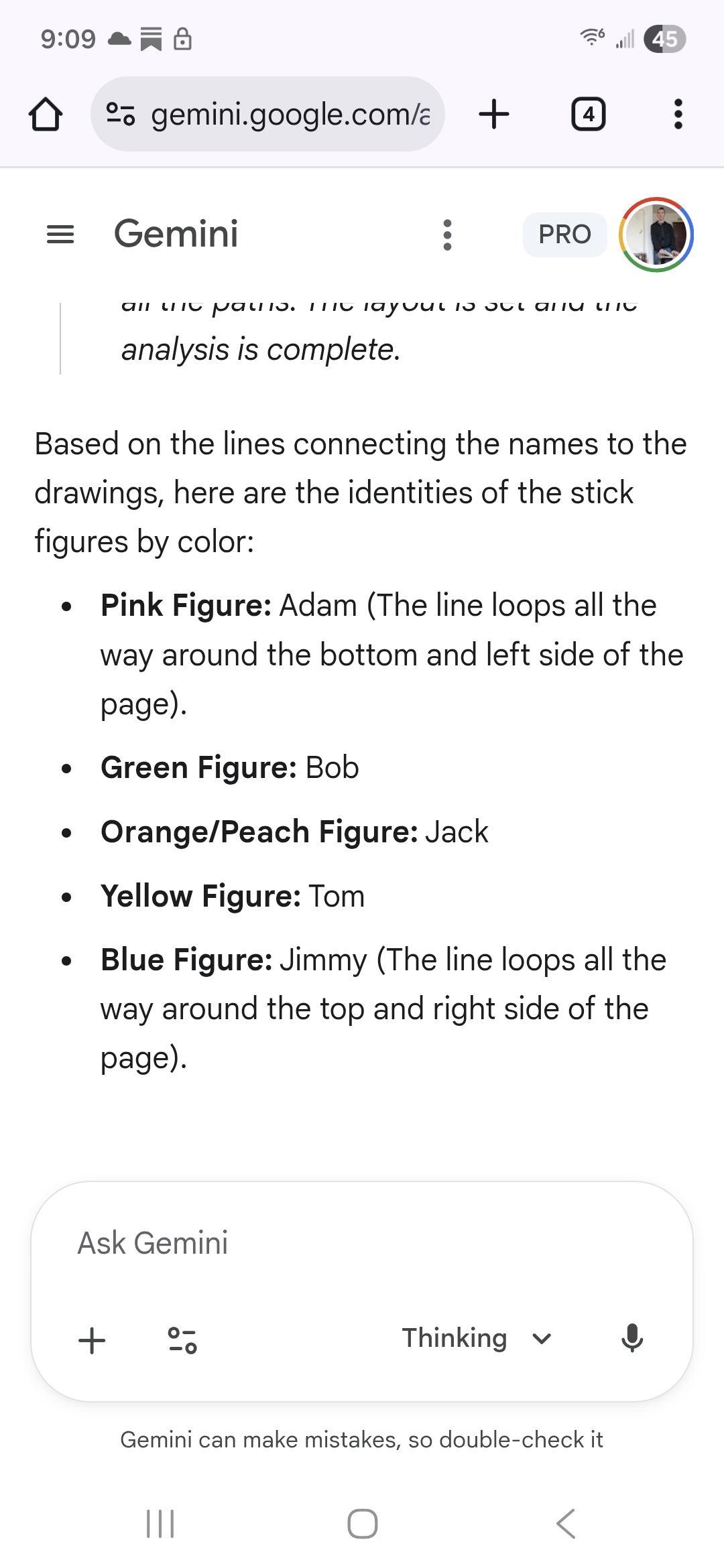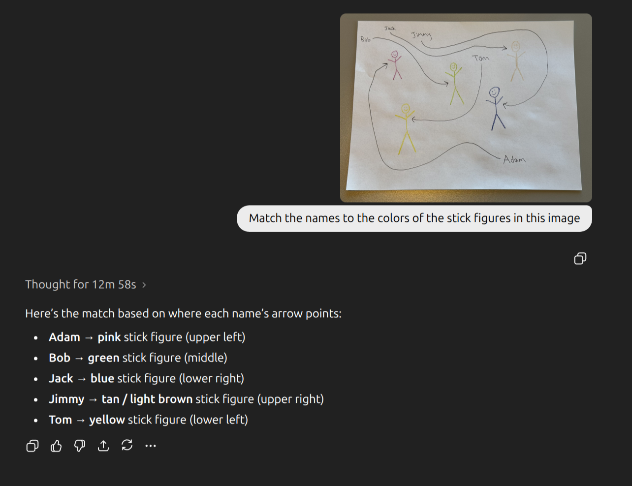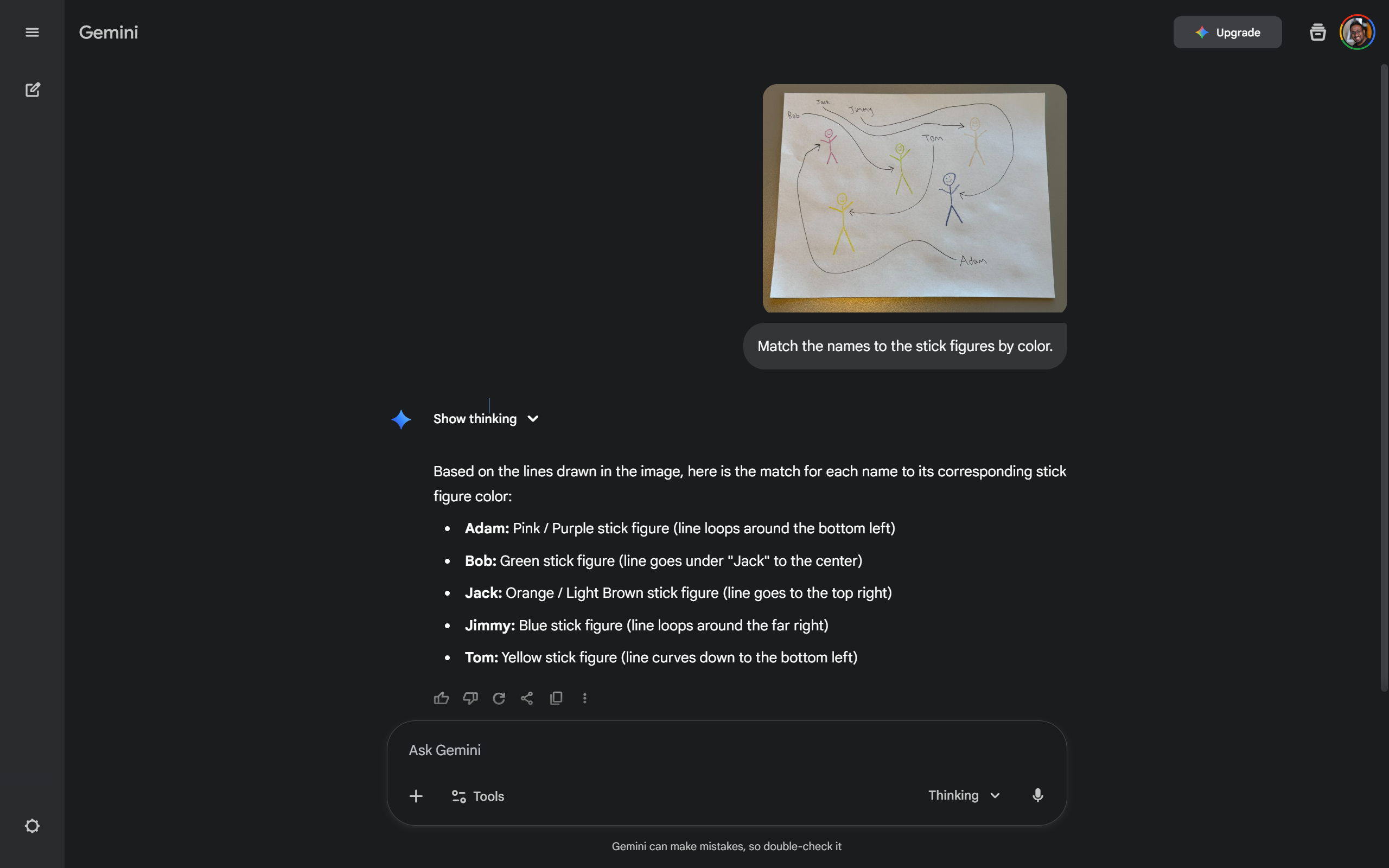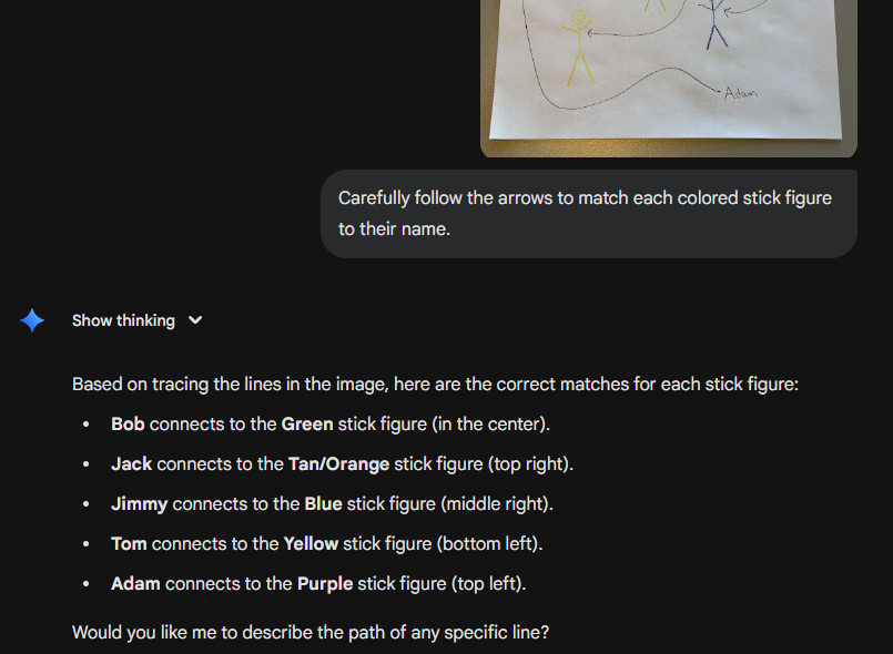 Gemini 3 gets it in the app. Every time the same prompt: "Match each name to the color of the stick figure its arrow points to"