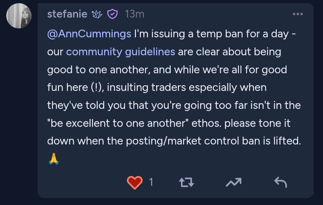 @BlackCrusade I did temp ban them for 24 hours - they can trade but are banned from commenting and managing their markets
