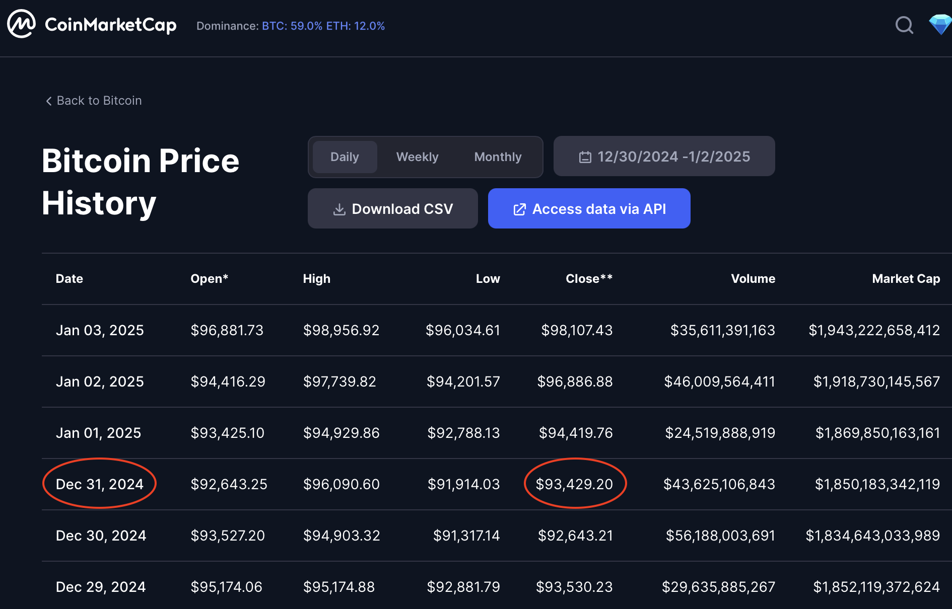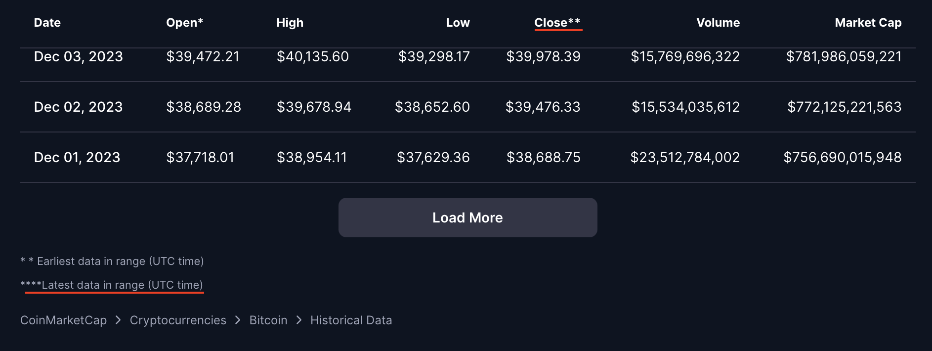 @BoltonBailey The description refers to CoinMarketCap, and they have historical data with daily closing at midnight UTC:
