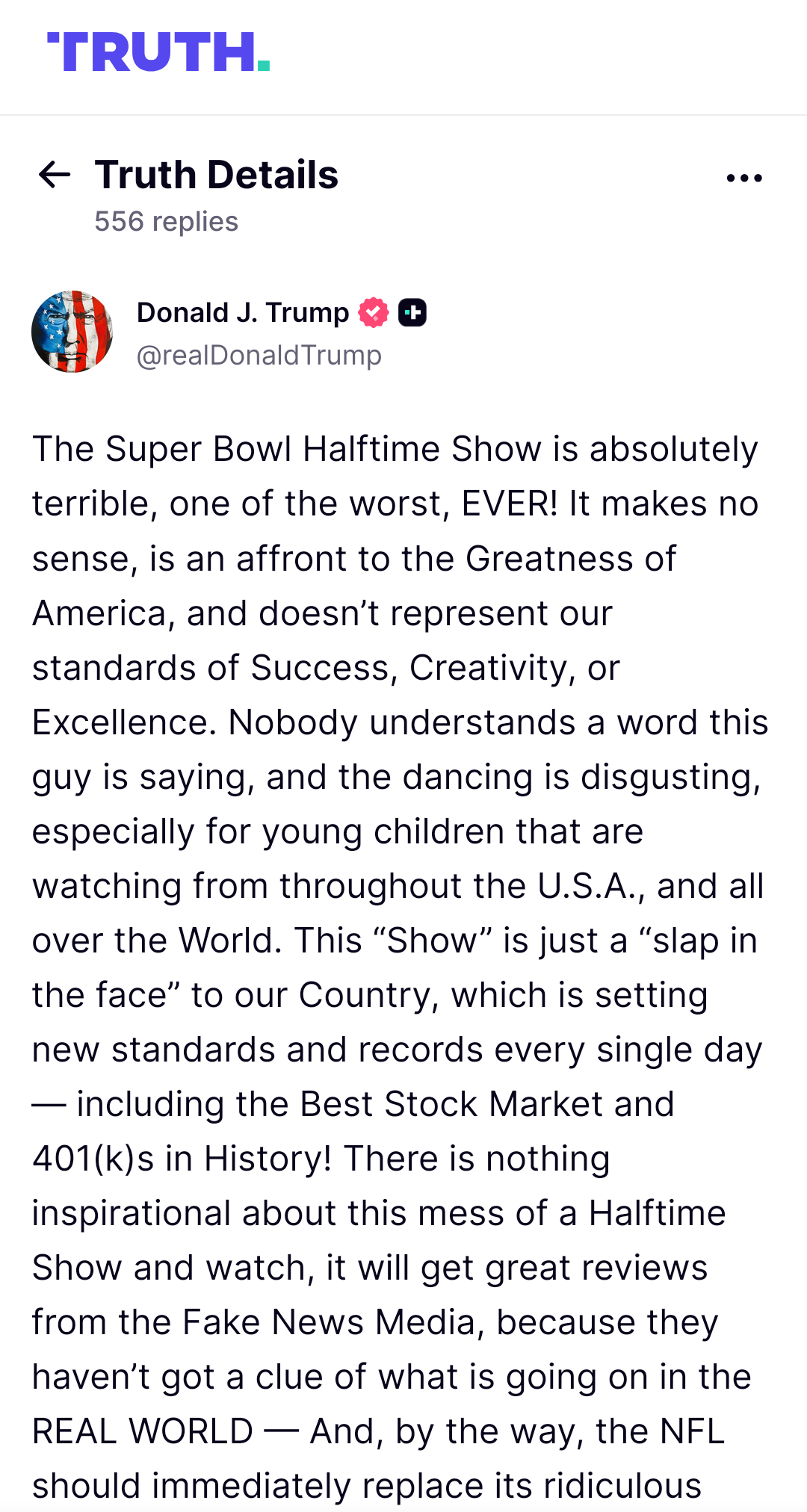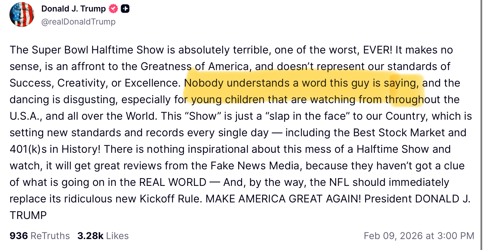 The Super Bowl Halftime Show is absolutely terrible, one of the worst, EVER! It makes no sense, is an affront to the Greatness of America, and doesn’t represent our standards of Success, Creativity, or Excellence. Nobody understands a word this guy is saying, and the dancing is disgusting, especially for young children that are watching from throughout the U.S.A., and all over the World. This “Show” is just a “slap in the face” to our Country, which is setting new standards and records every single day - including the Best Stock Market and 401(k)s in History! There is nothing inspirational about this mess of a Halftime Show and watch, it will get great reviews from the Fake News Media, because they haven’t got a clue of what is going on in the REAL WORLD — And, by the way, the NFL should immediately replace its ridiculous new Kickoff Rule. MAKE AMERICA GREAT AGAIN!