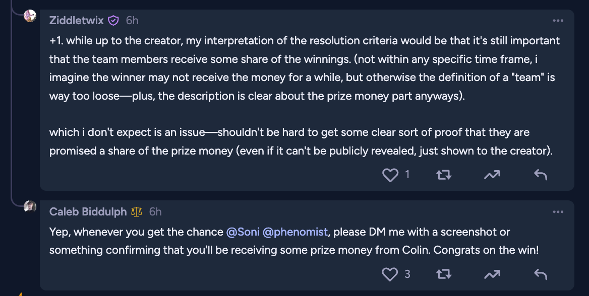 @Tripping I lost 25k mana on this and I think it's perfectly reasonable. The market description said from the beginning that team members would count as long as they receive a portion of the reward money from the officially winning person. Every market title has ambiguities and they're ideally resolved by the description text. So what's the problem exactly?