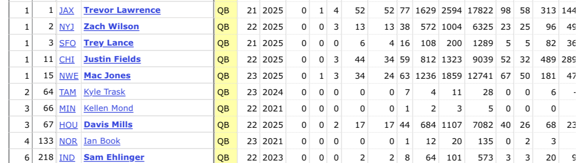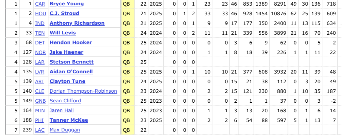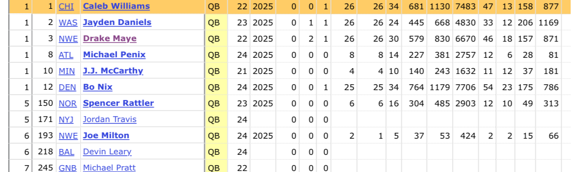based on the games played as well as their best season whereas Caleb and Bo aren’t top 10 QBs the way Jayden and Drake were top 5 in year 1 and 2 respectively