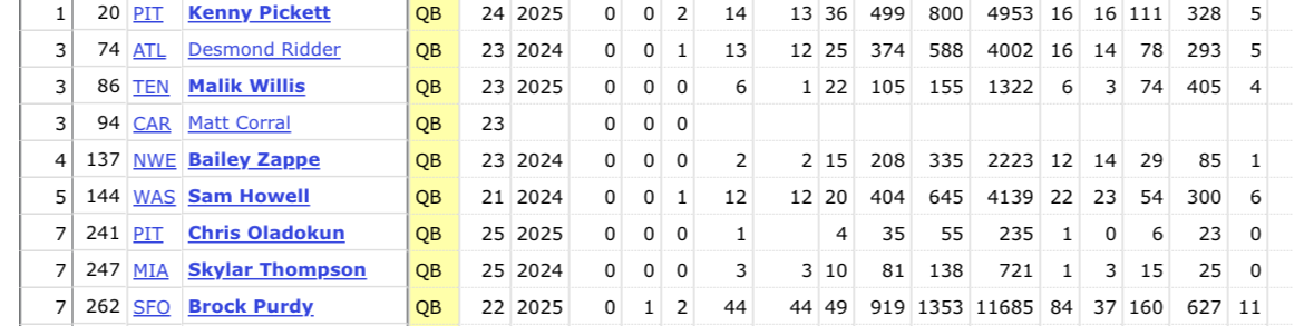 Purdy is first but Pickett vs Ridder vs Howell requires further analysis, Willis despite getting a large starting caliber contract was traded for just a 7th by the Titans so isn’t in contention for 2nd