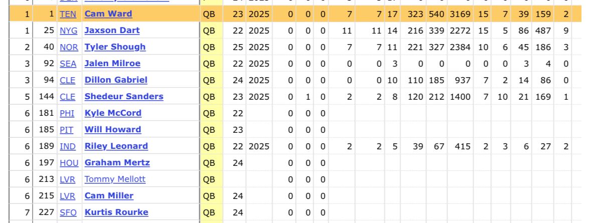 2025: Cam Ward vs Jaxson Dart - too early to say, Jaxson Dart seems like a 90% favorite after year 1, Cam Ward still has time on his rookie contract to prove otherwise, Tyler Shough seems to be better, but still too early and he’s older, Milroe is yet to start so Ward is ahead by default, he’s roughly on par with Gabriel / Sanders though he’s probably ahead