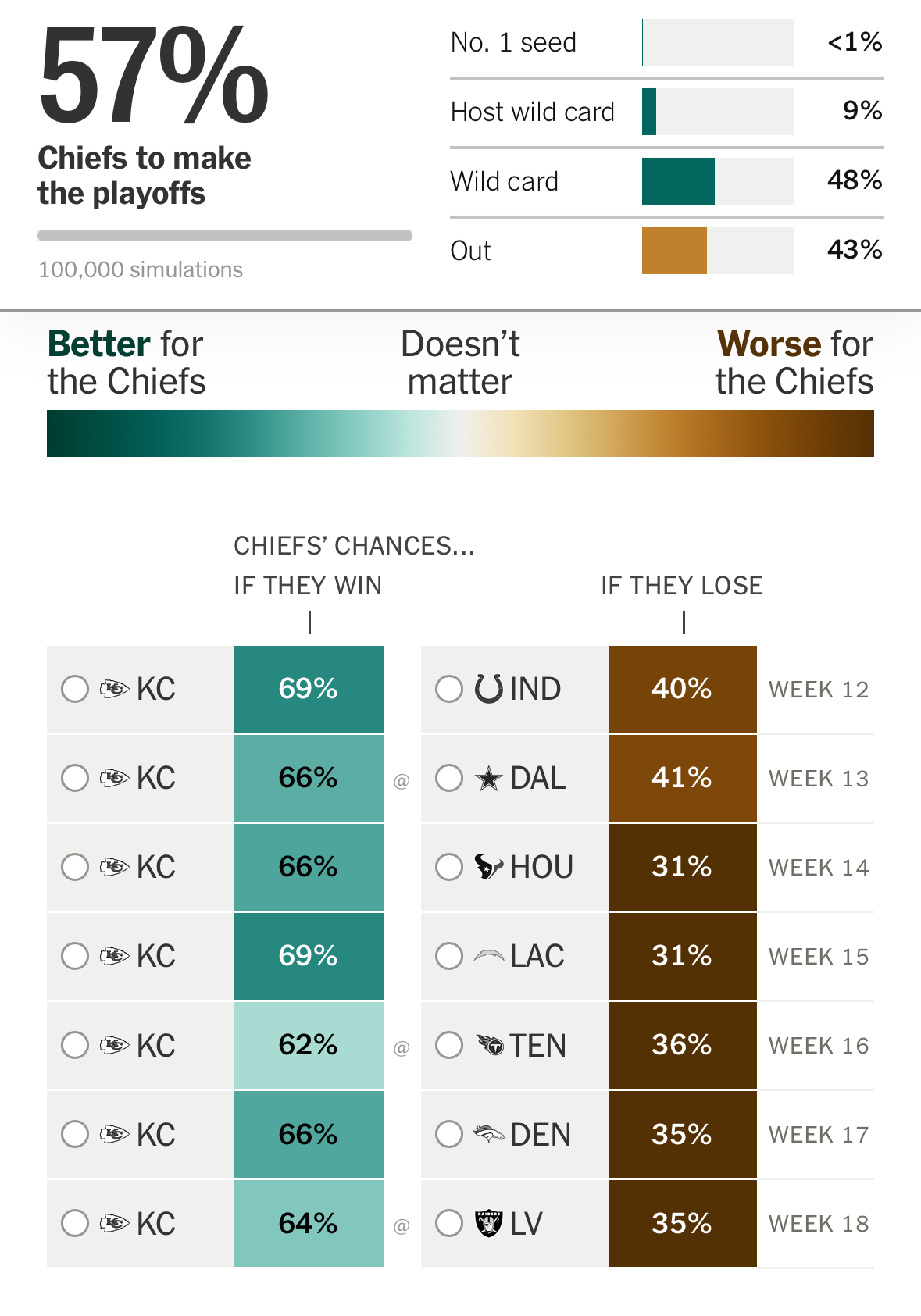 8-6: treading water, still a contender but may miss playoffs entirely, unlikely to win 10th straight division title