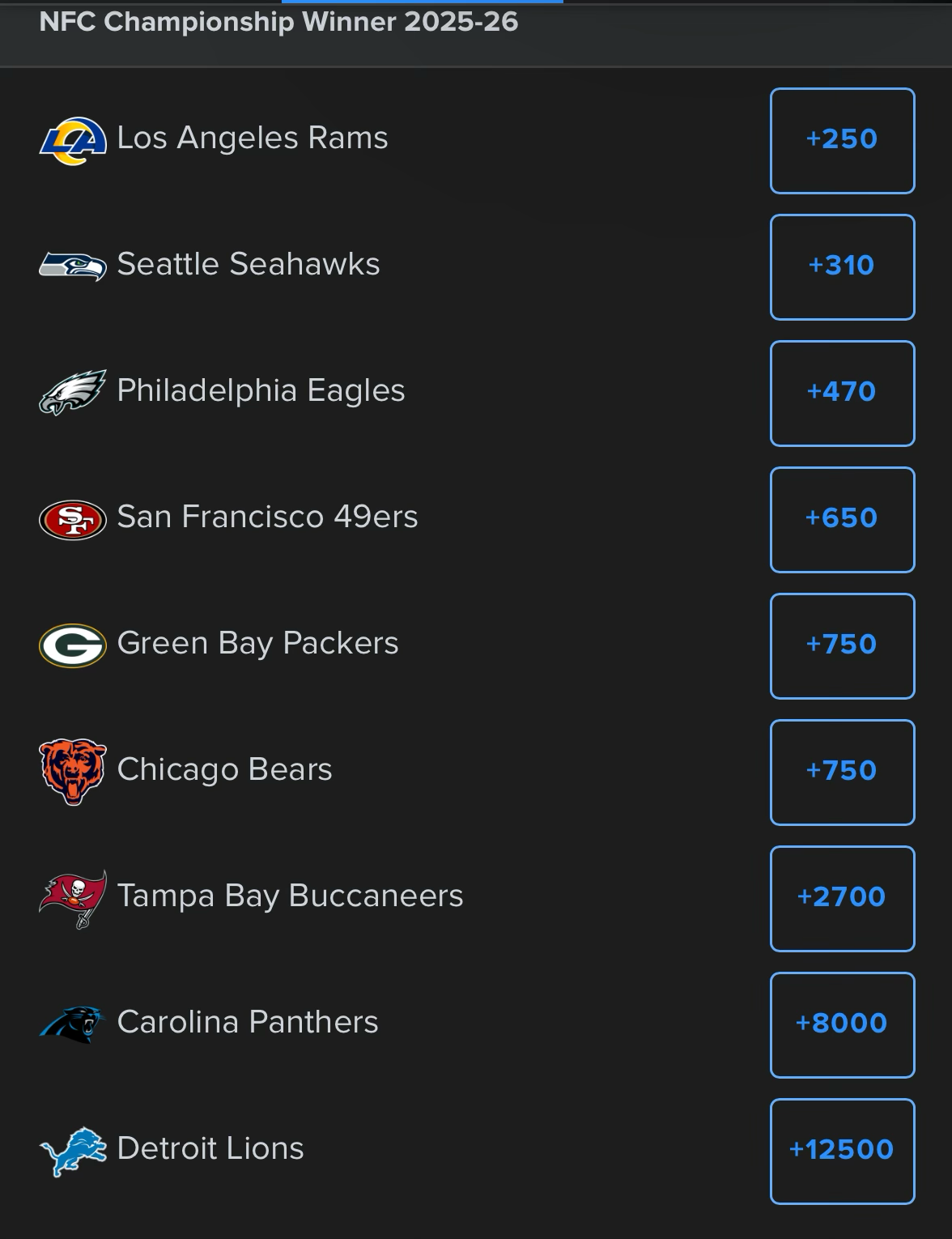 Using your NFC champ market (among these teams), West wins the NFC ~59.8%.