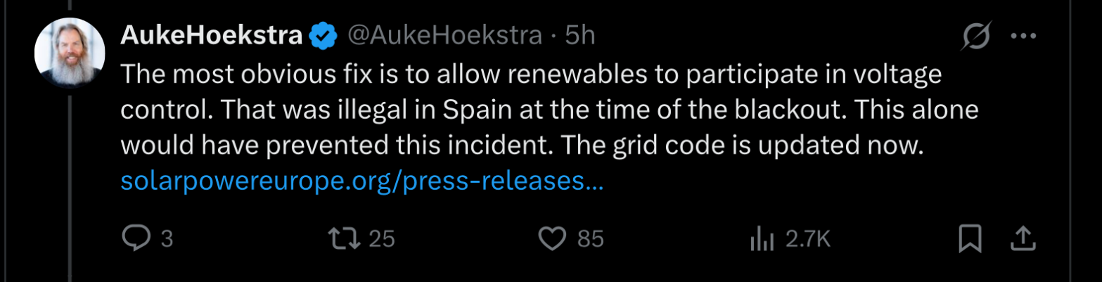 @Choms I'm uncertain about this but I would expect "Renewables made the grid less stable" and "Low or insufficient inertia" to also resolve true as as far as I can tell the reliance on a handful of thermal power plants for dynamic voltage control is because most of the generation is renewable, and that if there was less renewables on the grid, there would have been more thermal power generation, less/no need for dynamic voltage control, a smaller voltage spike, and less/no blackout. https://www.endesa.com/en/the-e-face/electrical-grid/voltage-control-grid-blackout aligns with this interpretation although also points out regulatory aspects preventing solar plants from contributing to voltage control so it doesn't seem as simple as "renewables bad".