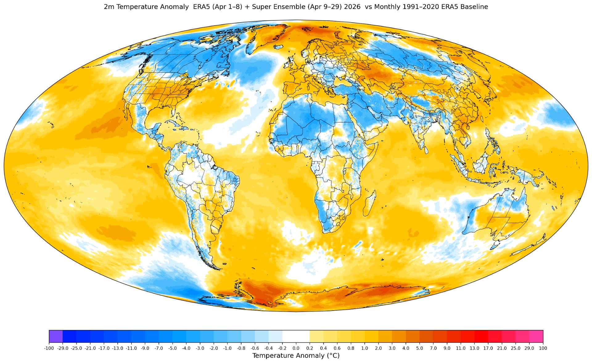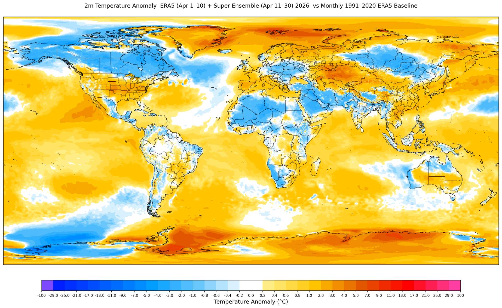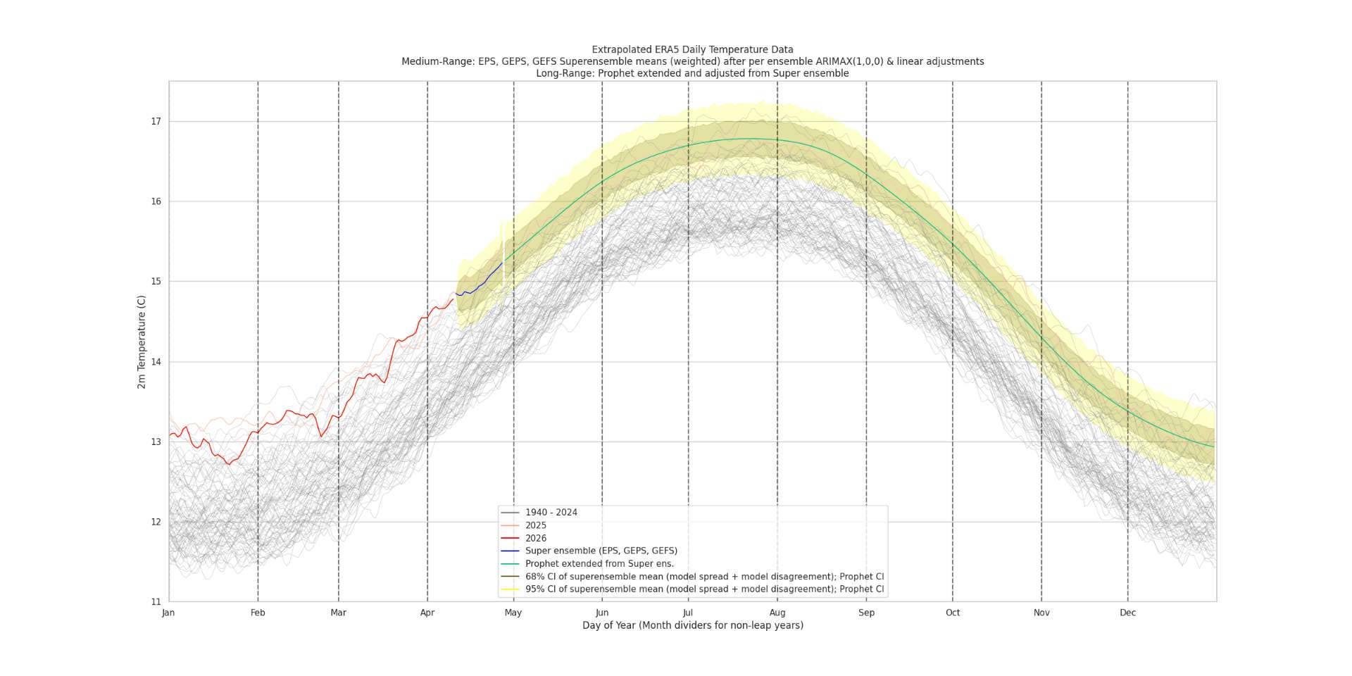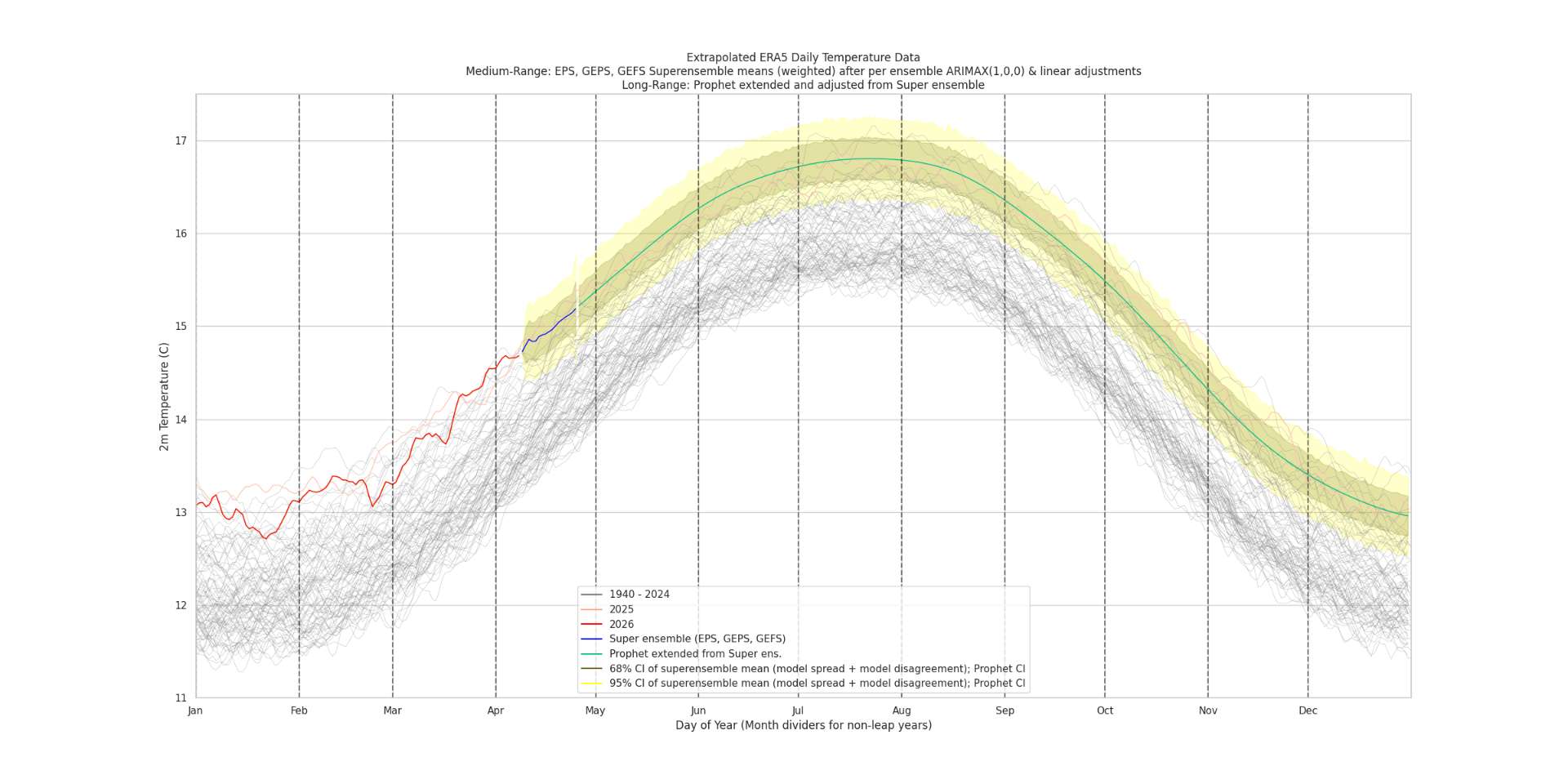 Based on my superensemble, the ERA5 t2m should be around 14.92 C for April 2026 (there is a slight adjustment upward based on each forecast day's long term super ensemble bias (relative to what validates in ERA5) that moves it up +0.02C from 14.90) in the current run).