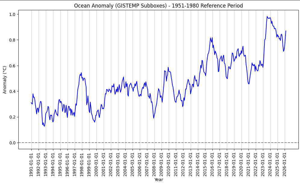 the land anomaly for the subboxes was +0.95 C and the ocean was +0.45 C relative to the 1991-2020 baseline for gistemp loti... (this will be different than the actual final gistemp global loti computations, due to the compositor which would weight the subboxes differently, and also finally apply different debiasing for certain bands):
