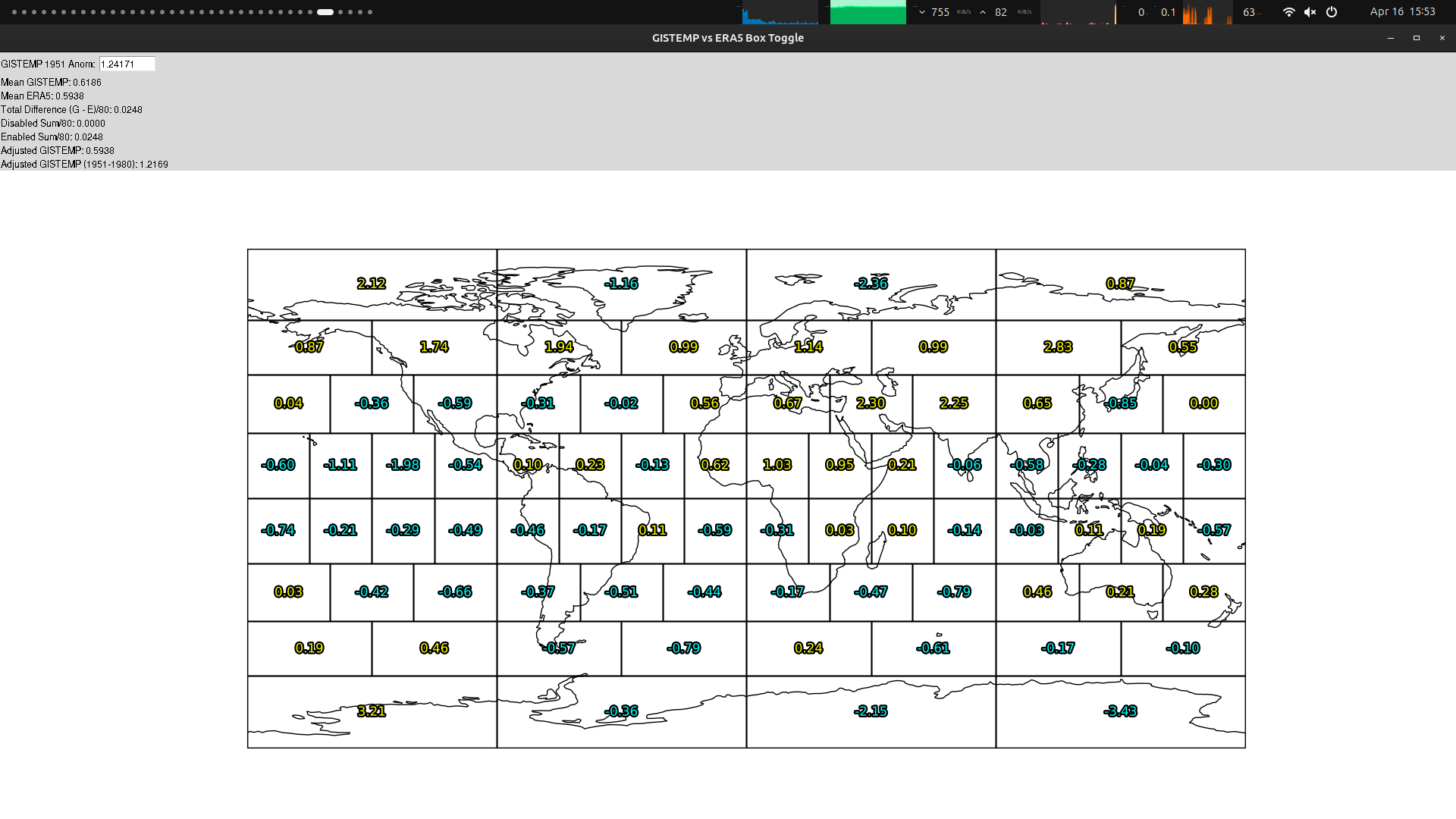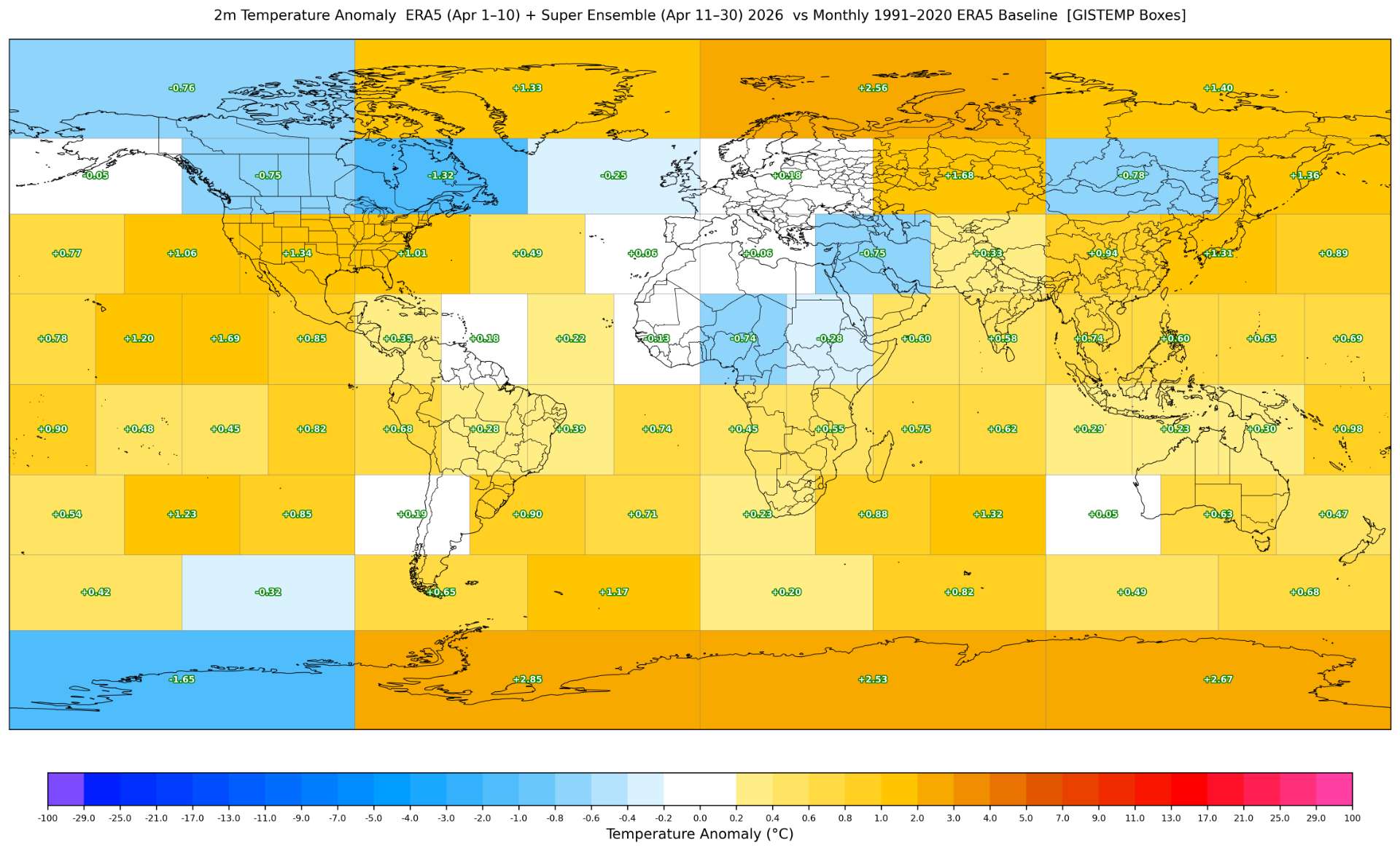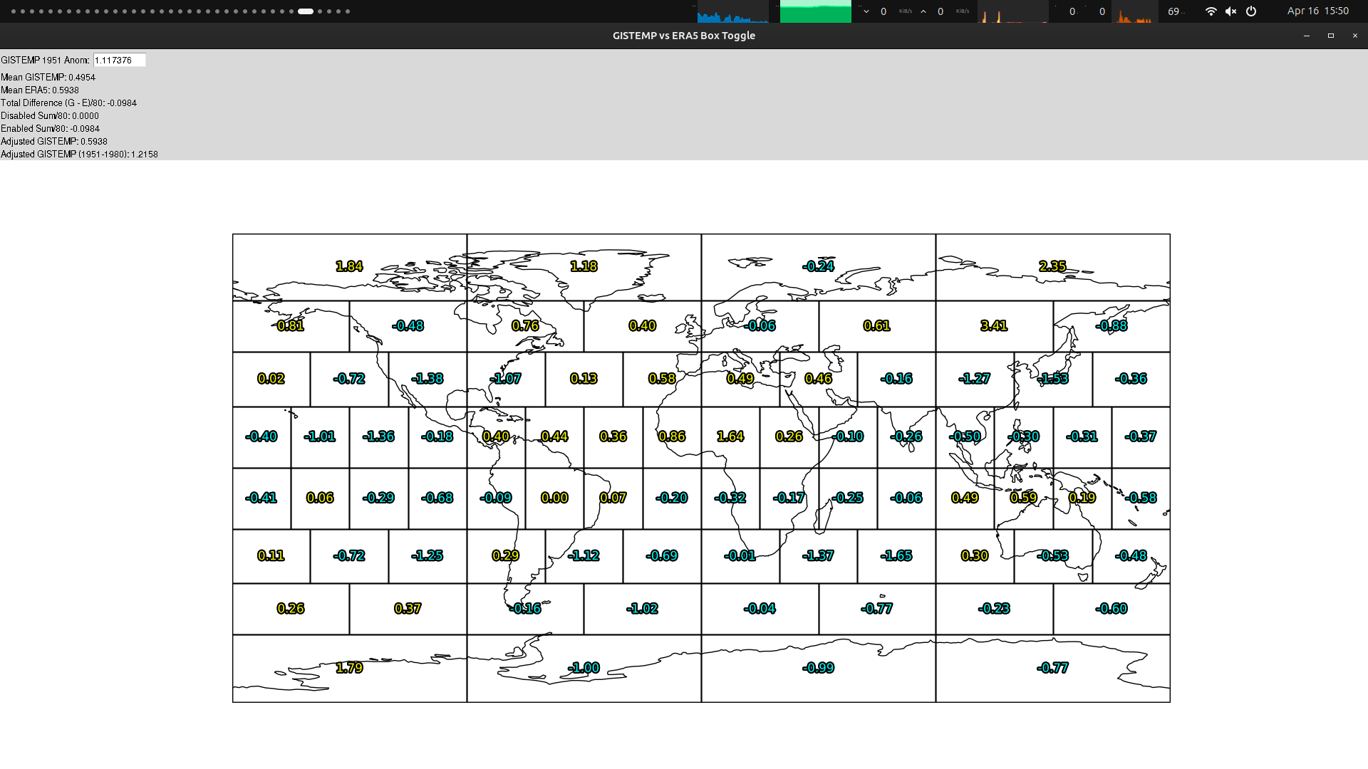 Interestingly when I compare the ERA5+forecast box interpolations to the GISTEMP Box values (i.e. the mixedBX npz) for April 2020 and 2025, on the differences between each box (i.e. taking that there is zero bias between the anomalies for the ERA5 interpolated boxes and the GISTEMP boxes, which definitely isn't the case), however, both data suggest a value of ~1.22 C (1.216 and 1.217 C respectively). This is a partly separate data computation (still relies on superensemble biases calculated, but then adjusts a gridded ERA5+superensemble and interpolates directly). I am not sure if its a coincidence that they line up so well, or whether this is superior to the other method I've been using -- it is only 2 data points: (GISTEMP 2025 - (ERA5&superensemble) 2026 April boxes, and for GISTEMP 2020 - ""; i.e +# means colder now )
