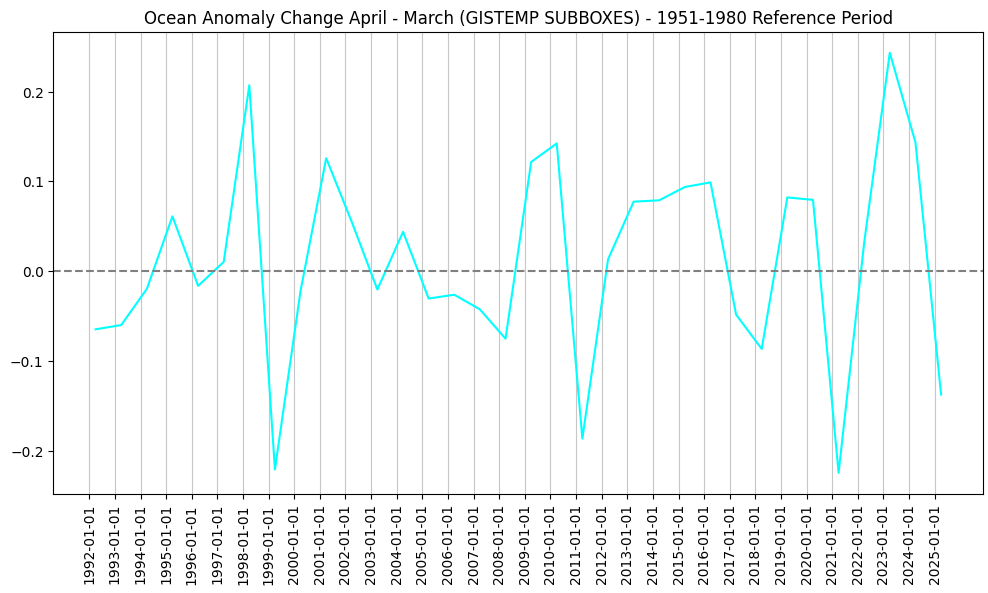 For reference... The April-March change is usually neutral, with a stddev is ~ 0.11 C, but given the situation I would expect the April-March change to be neutral-to-positive than negative given the situation, which implies a ocean anomaly warmer than 2025.
