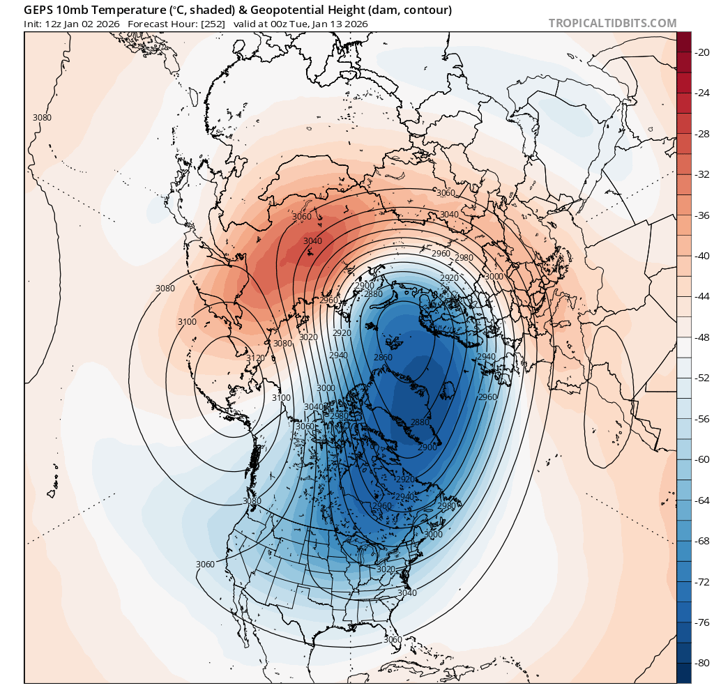 Based on my own outlooks from looking at forecasts for the last month I'm going to speculate and say most of this predictability was driven from the abnormally warm November temps in the NH coming into December, and the stability that it bought as far as in the NH decreasing the chances of disruptions to the jetstream (strat. polar vortex only stretched/displaced and didn't split), with less, and shorter blasts of Arctic air. Hard to say if it will continue, but it looks like for now its more of the same for January so far based on the ensembles, with a repeat of a stretched/displaced PV at the moment.