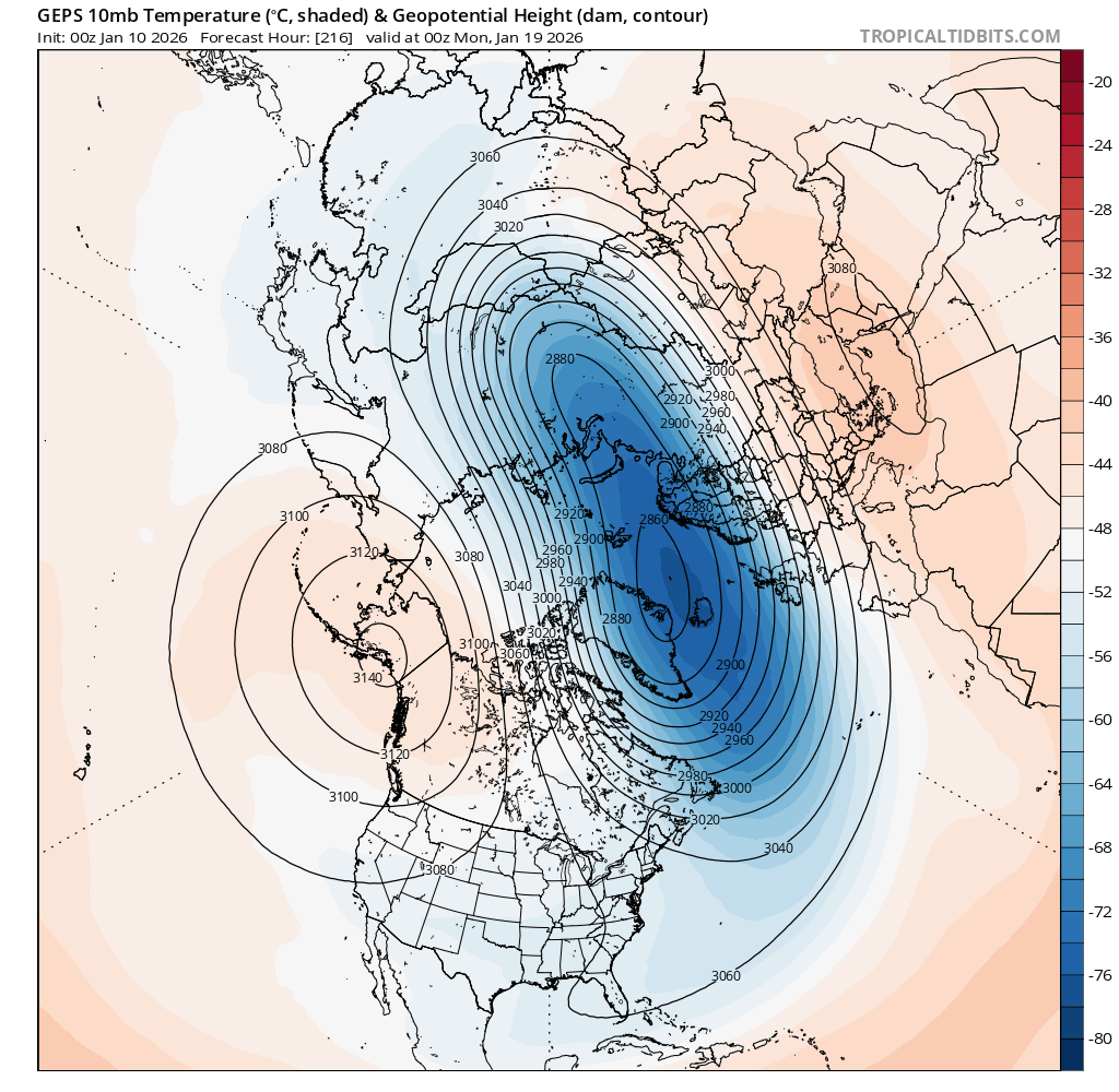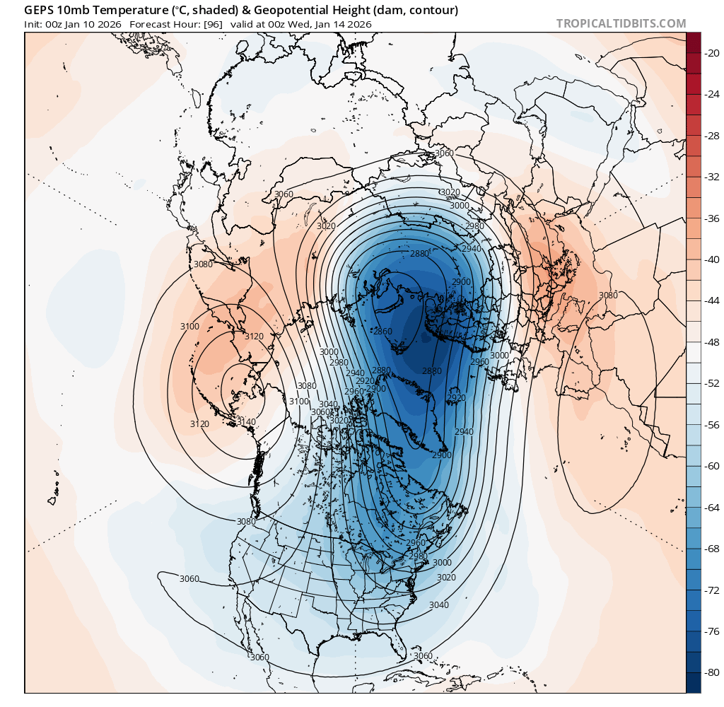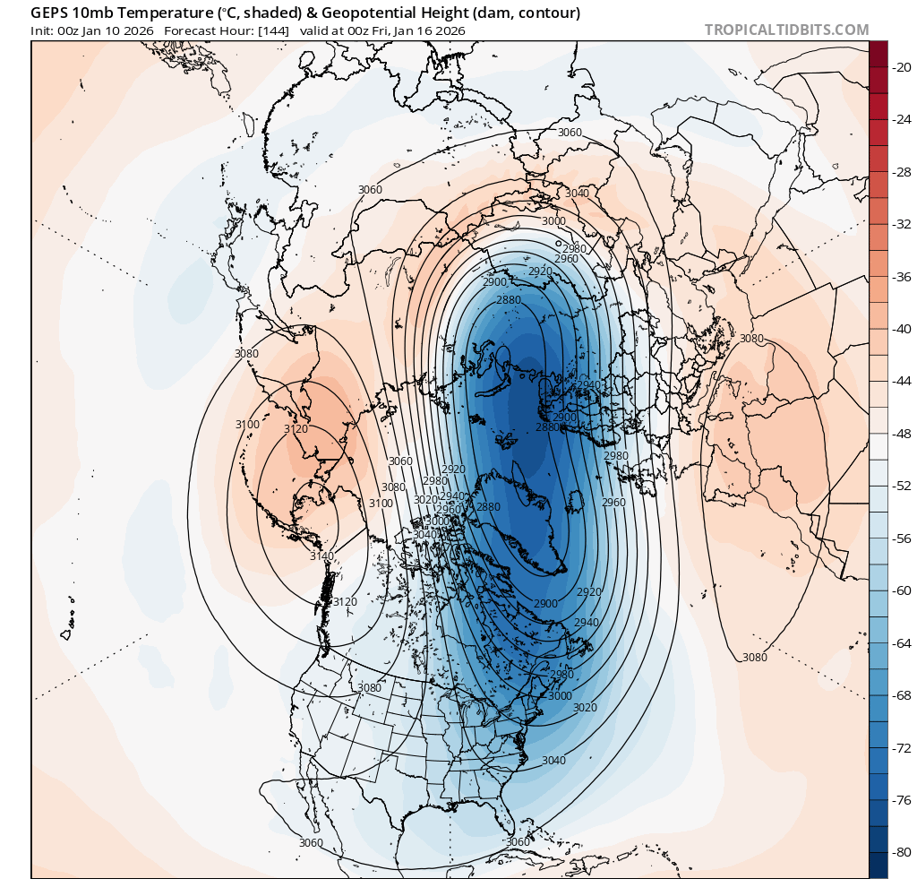 The polar vortex starts getting disrupted and stretched over the next few days, but its supposed to strengthen back to above normal before the end of the month ..