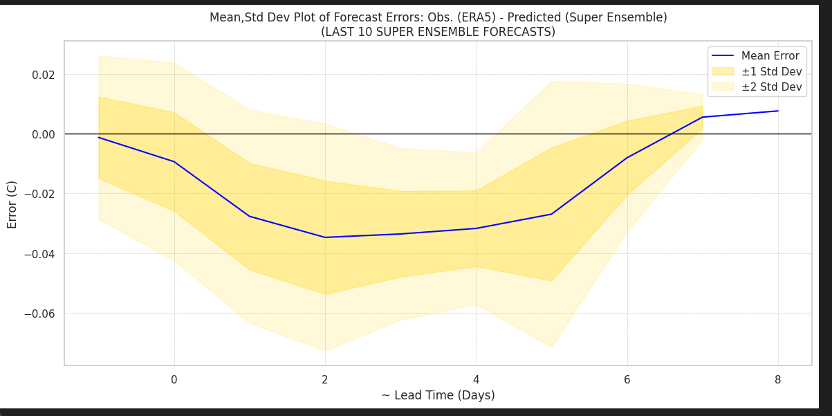 Recent errors for short lead times for the superensemble haven't been particularly bad. With 6 days left, despite models being on slightly the warm side (fairly usual performance), even a average daily conservative error with respect to ERA5 of -0.03 wouldn't amount to a change more than -0.03*6/31 ~= -0.006 C, which wouldn't anywhere near account for the discrepancy between our center point predictions and Polymarket's implied one.