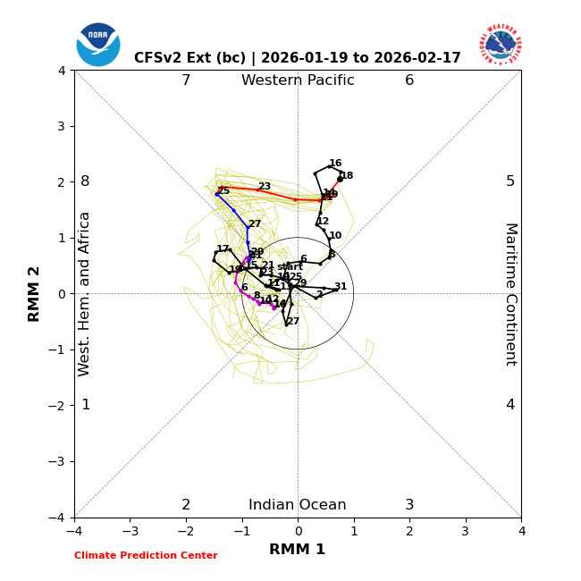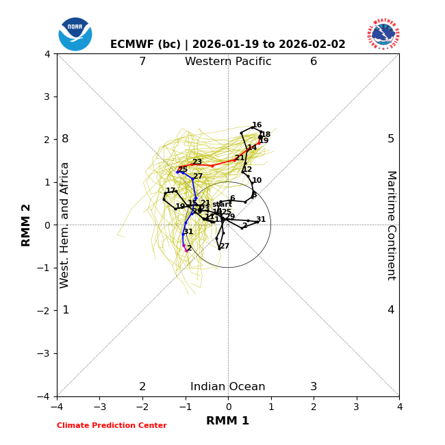 Examining the det. models and the ensembles for the runs of the last 3 days it appears there is a trend towards a weakening of the MJO towards the end of the month as it moves into phase 8.