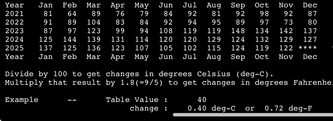 January 2024 might show as 124 in hundredths of a degree C, this is +1.24C above the 1951-1980 base period. If it shows as 1.22 then it is in degrees i.e. 1.22C. Same logic/interpretation as this will be applied.
