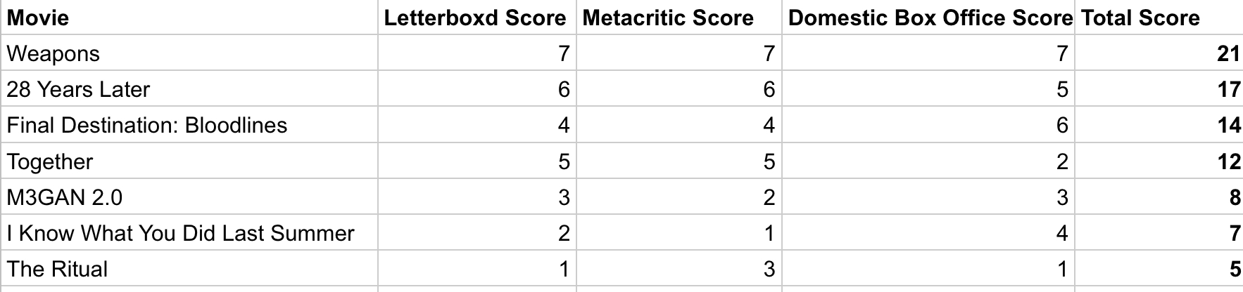 This market ranks the following 2025 horror movies by a composite score made up of three components: