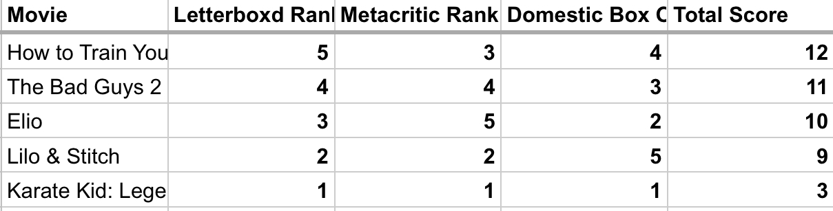 This market resolves based on the cumulative performance of each listed family film across three metrics: